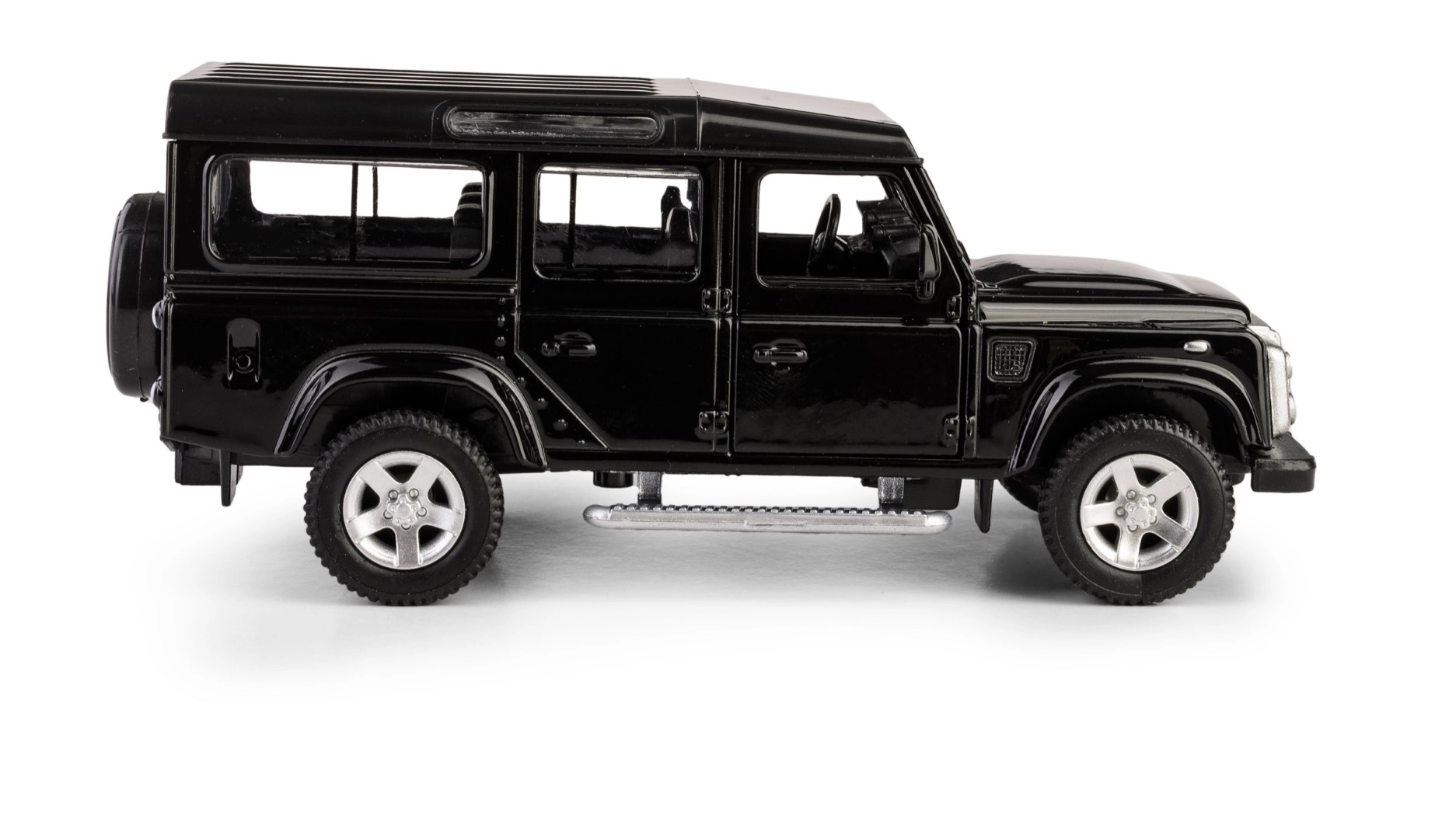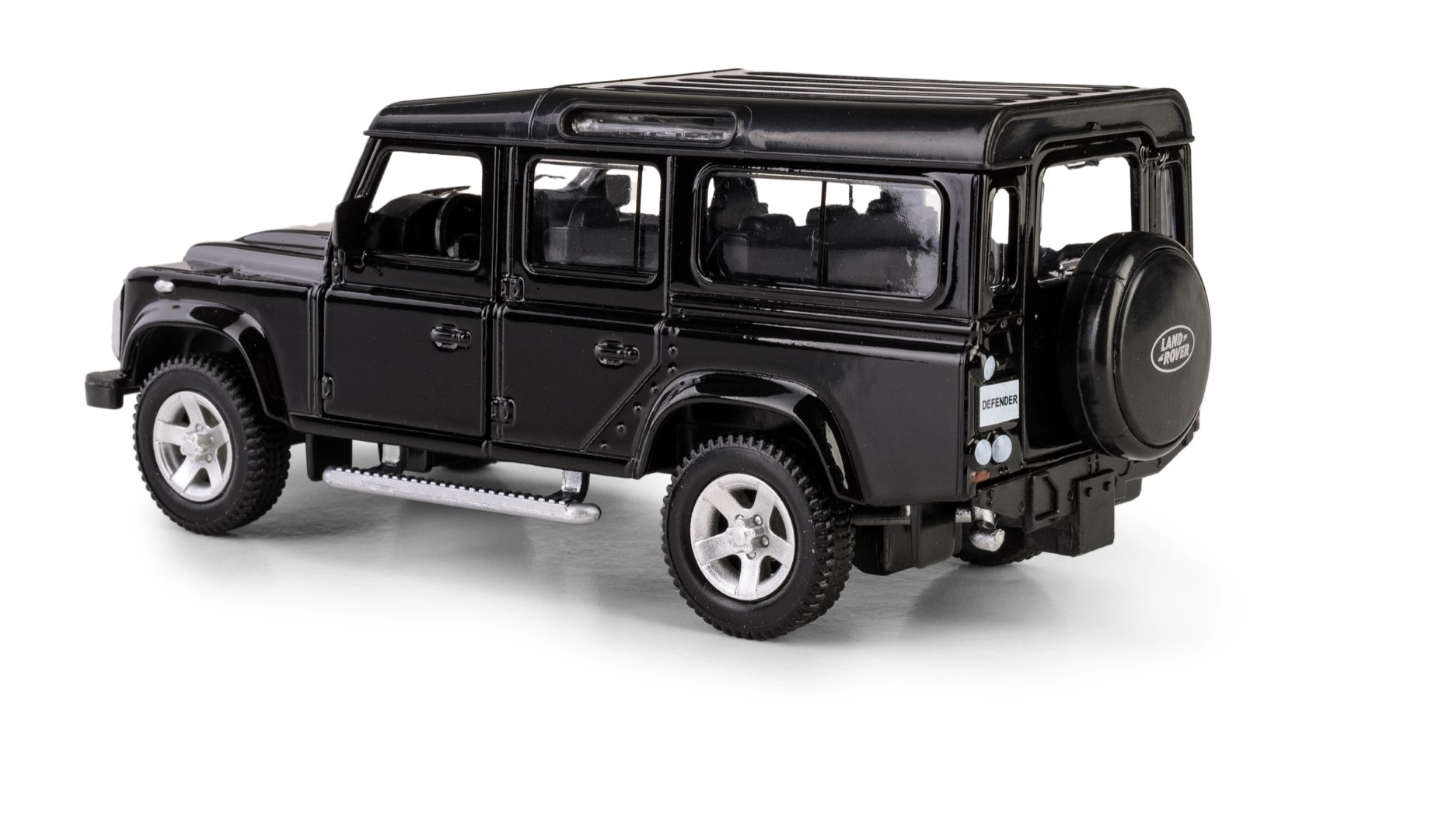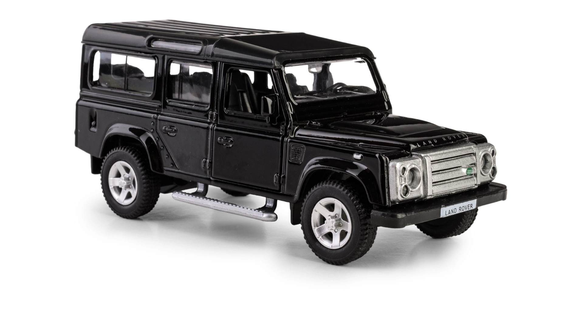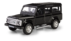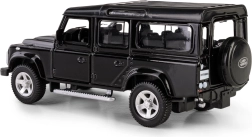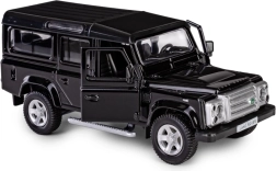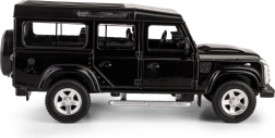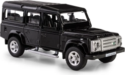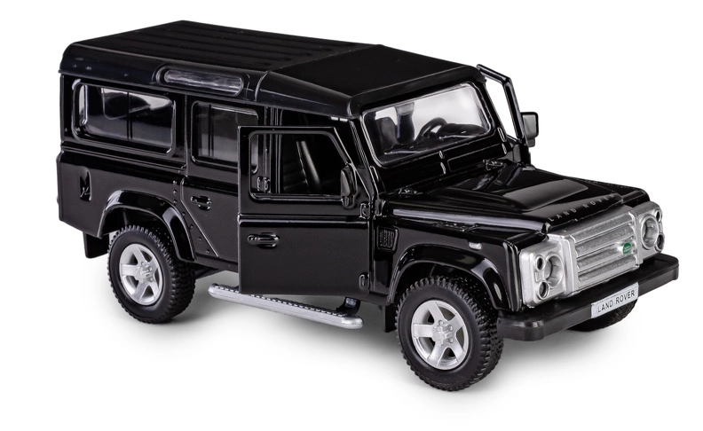 Odkrijte podrobno repliko legendarnega terenskega vozila LAND ROVER Defender 110 v elegantni črni barvi. Ta die-cast model v merilu 1:35 združuje kovinske dele s plastičnimi detajli, da zvesto ujame značilne linije, masko hladilnika, platišča in robustno silhueto izvirnika. Odpirajoča se sprednja vrata omogočajo vpogled v skrbno izdelano notranjost.