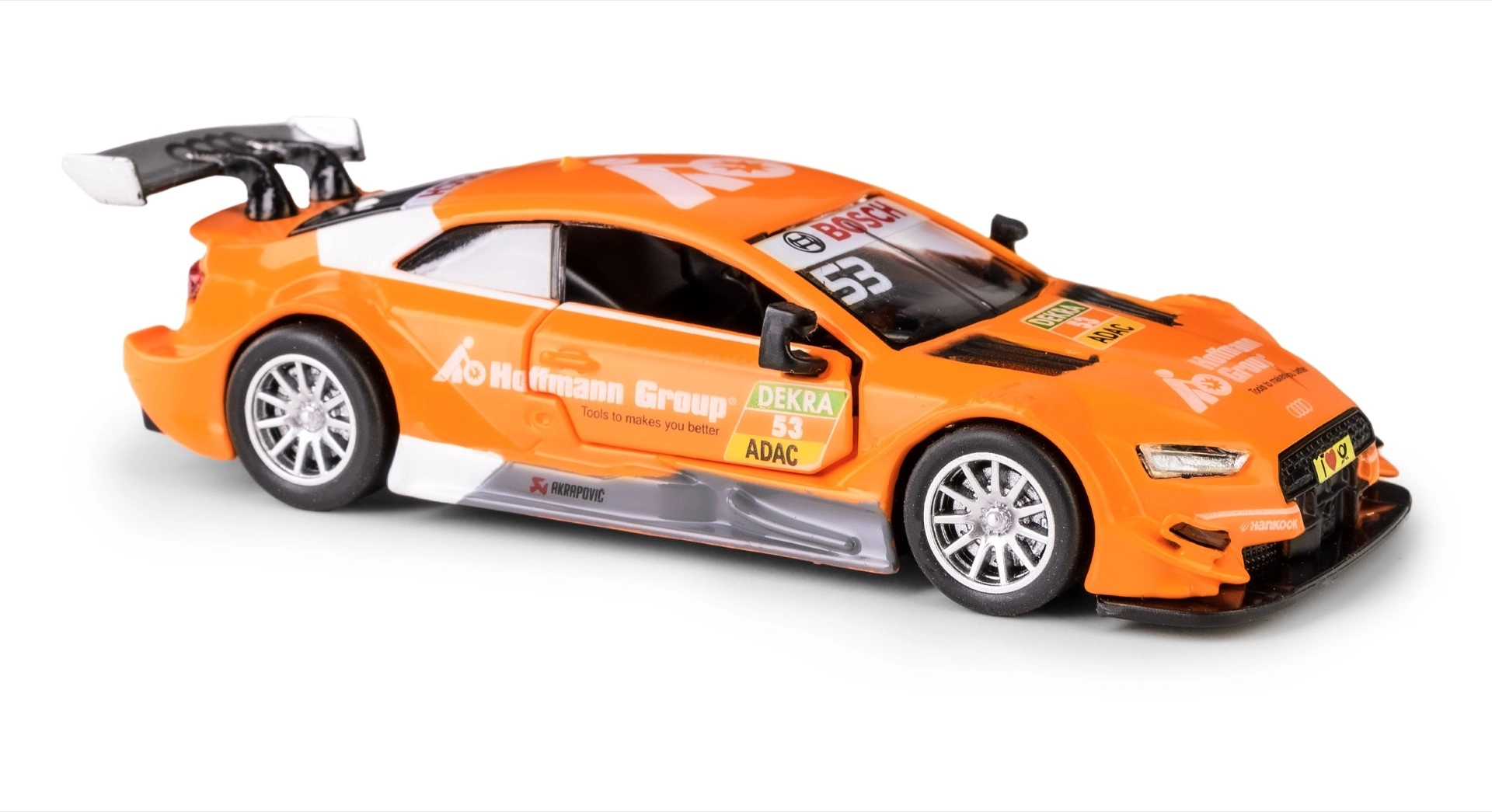 Natančno izdelan kovinski model AUDI RS 5 DTM v merilu 1:43 bo navdušil zbiratelje in mlade ljubitelje avtomobilizma. Ponuja odpirajoča se vrata, vzvratni navijalni mehanizem (pull-back) in gumijaste pnevmatike za realističen videz in zabavno funkcionalnost. Trpežna zasnova iz kovine in plastike, netoksičen lak ter primernost od 3 let ga naredijo za varno in vzdržljivo igračo.