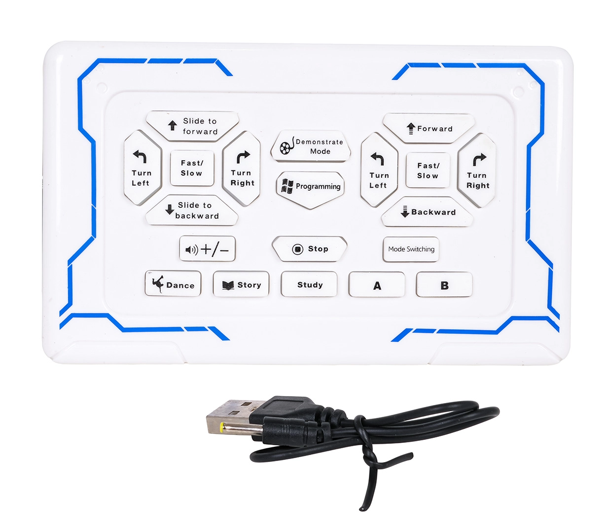 robot, daljinski upravljalnik, USB polnilni kabel, navodila