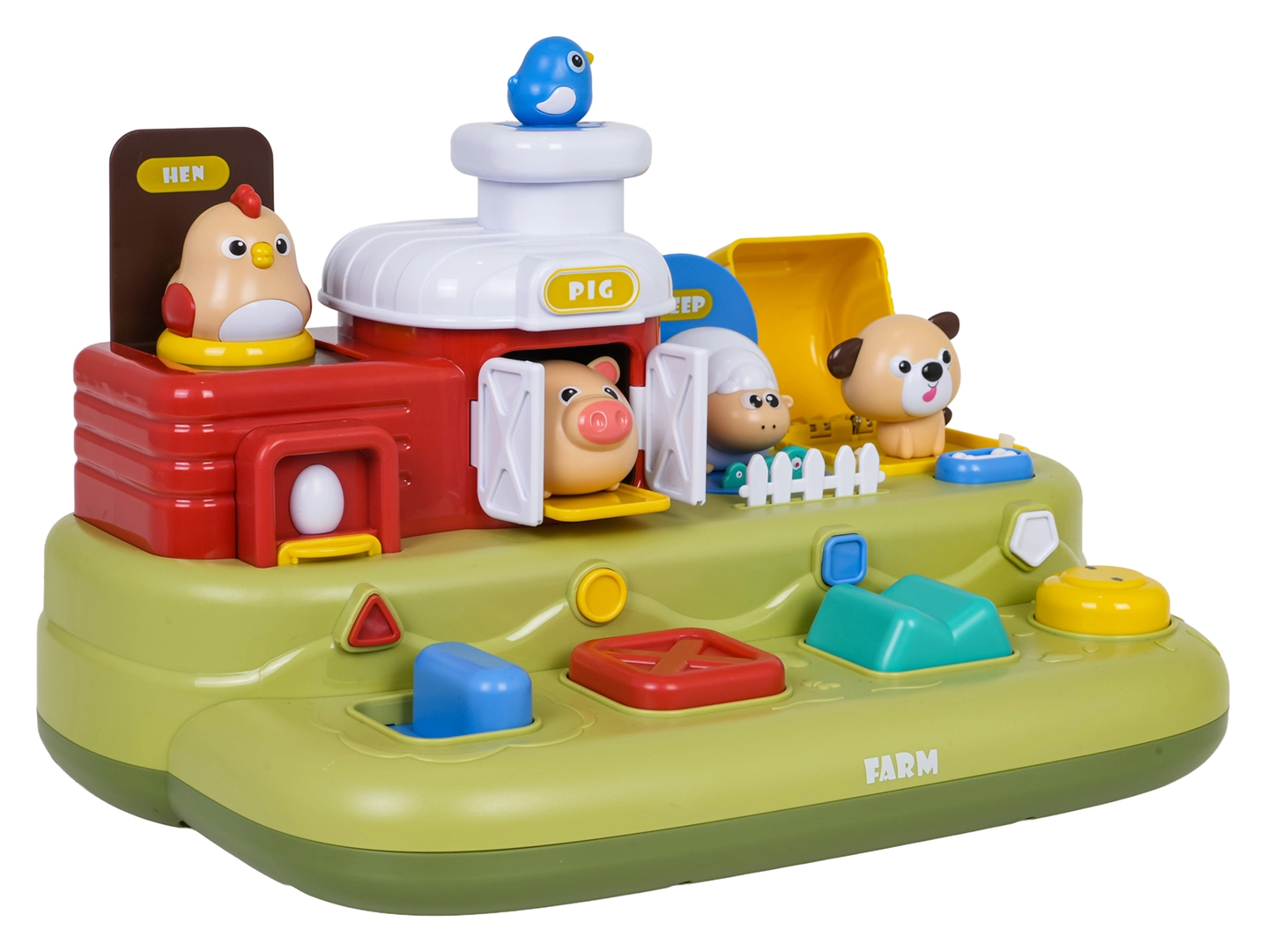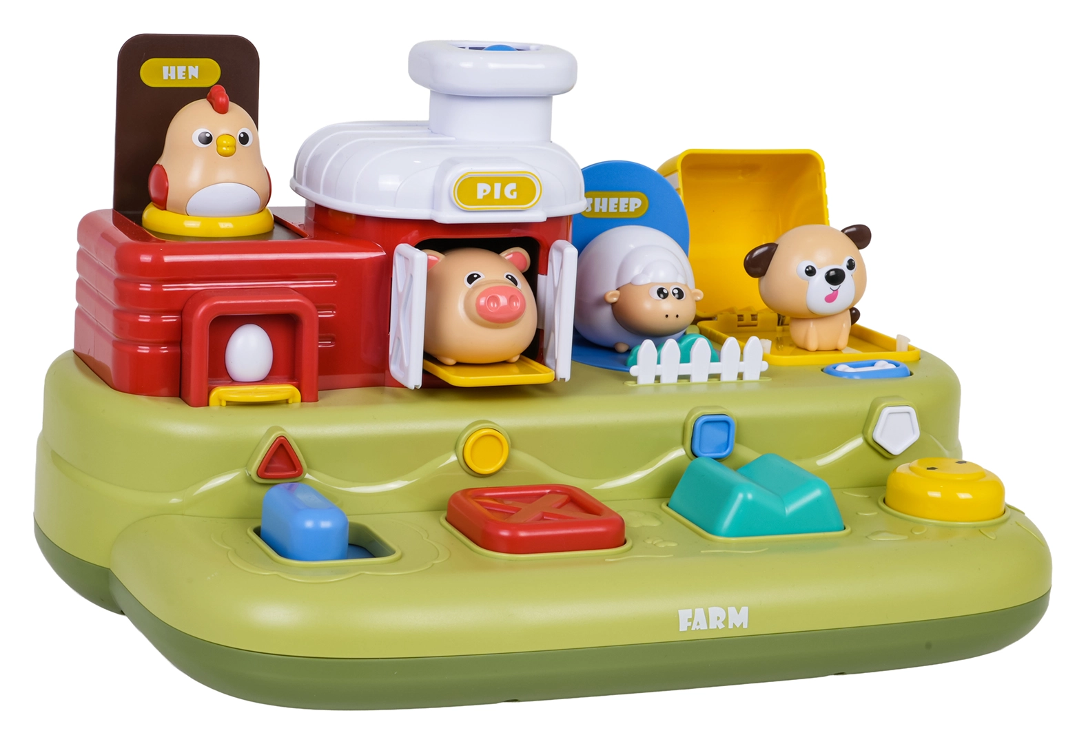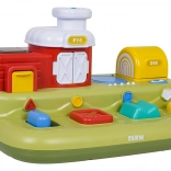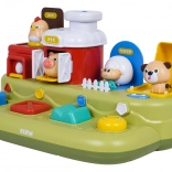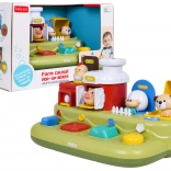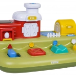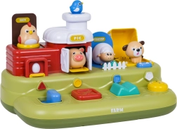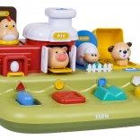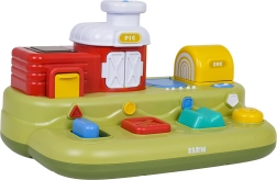 Ta vesela kmetija prinaša otrokom veliko odkrivanja: po pomiku modrega drsnika skoči piščanček, s pritiskom na rdeč gumb se odprejo vratca s prašičkom, s pritiskom na zelenega se pokaže ovčka, z vrtenjem rumenega gumba pa pokuka kužek. Nad upravljalnimi elementi so dodatni gumbi, ki sprožajo melodije, živalske zvoke in druge učinke.