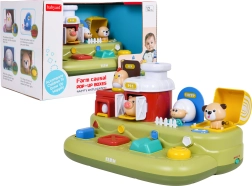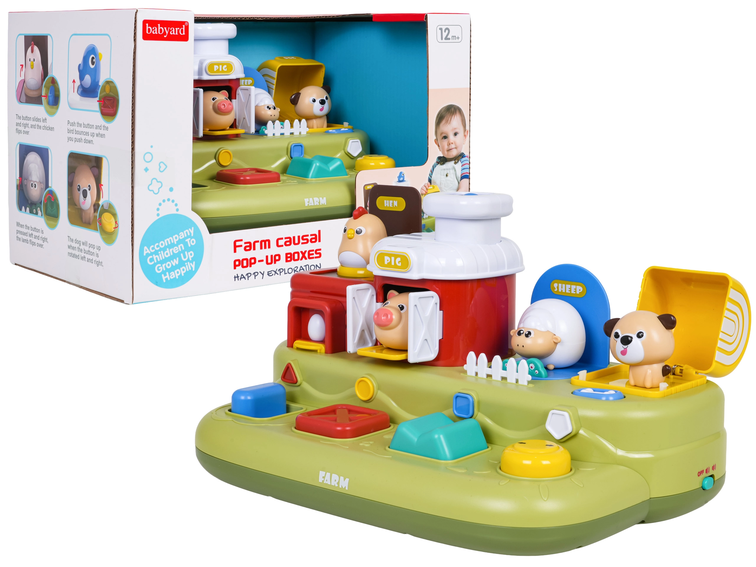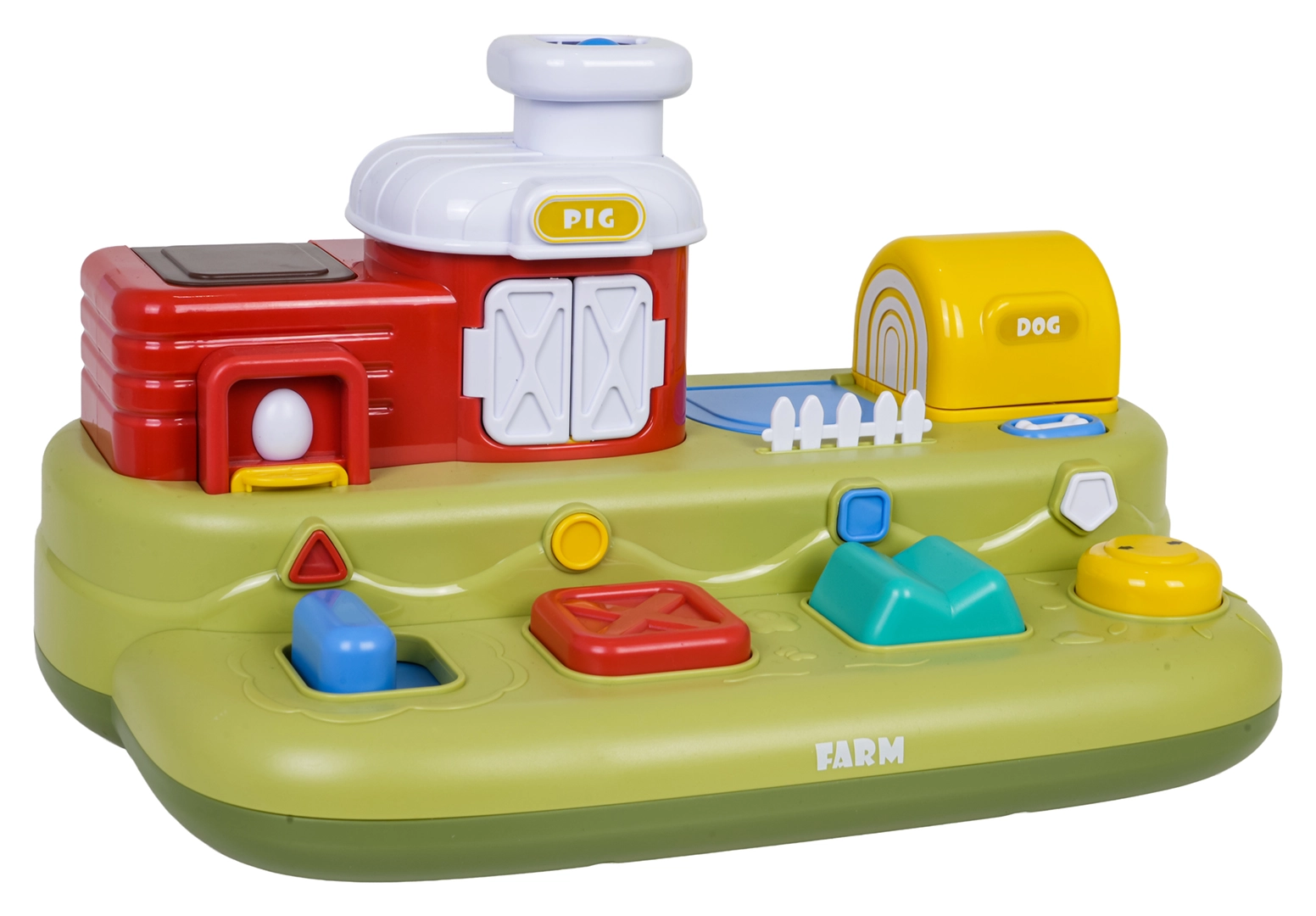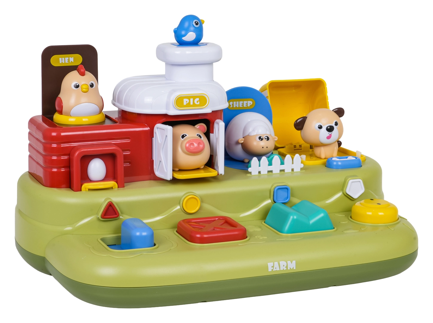 Ta vesela kmetija prinaša otrokom veliko odkrivanja: po pomiku modrega drsnika skoči piščanček, s pritiskom na rdeč gumb se odprejo vratca s prašičkom, s pritiskom na zelenega se pokaže ovčka, z vrtenjem rumenega gumba pa pokuka kužek. Nad upravljalnimi elementi so dodatni gumbi, ki sprožajo melodije, živalske zvoke in druge učinke.