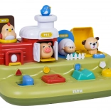 Različni mehanizmi (pritisk, pomik, vrtenje) razkrijejo piščančka, prašička, ovčko in kužka. Otroci hitro razumejo povezavo med akcijo in reakcijo ter hkrati vadijo fino motoriko.