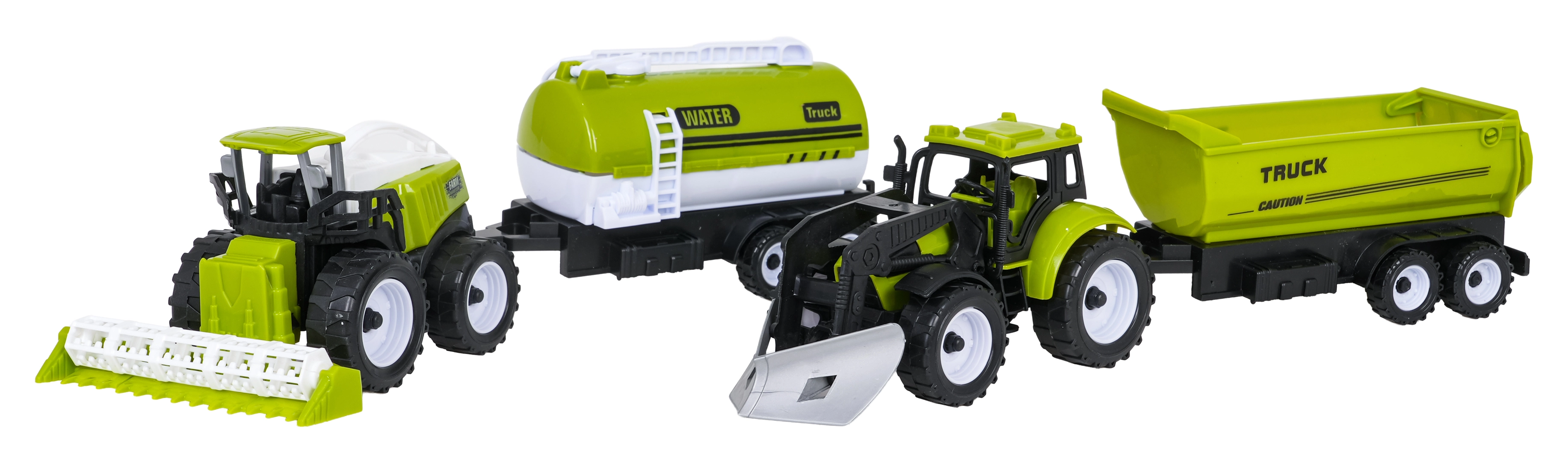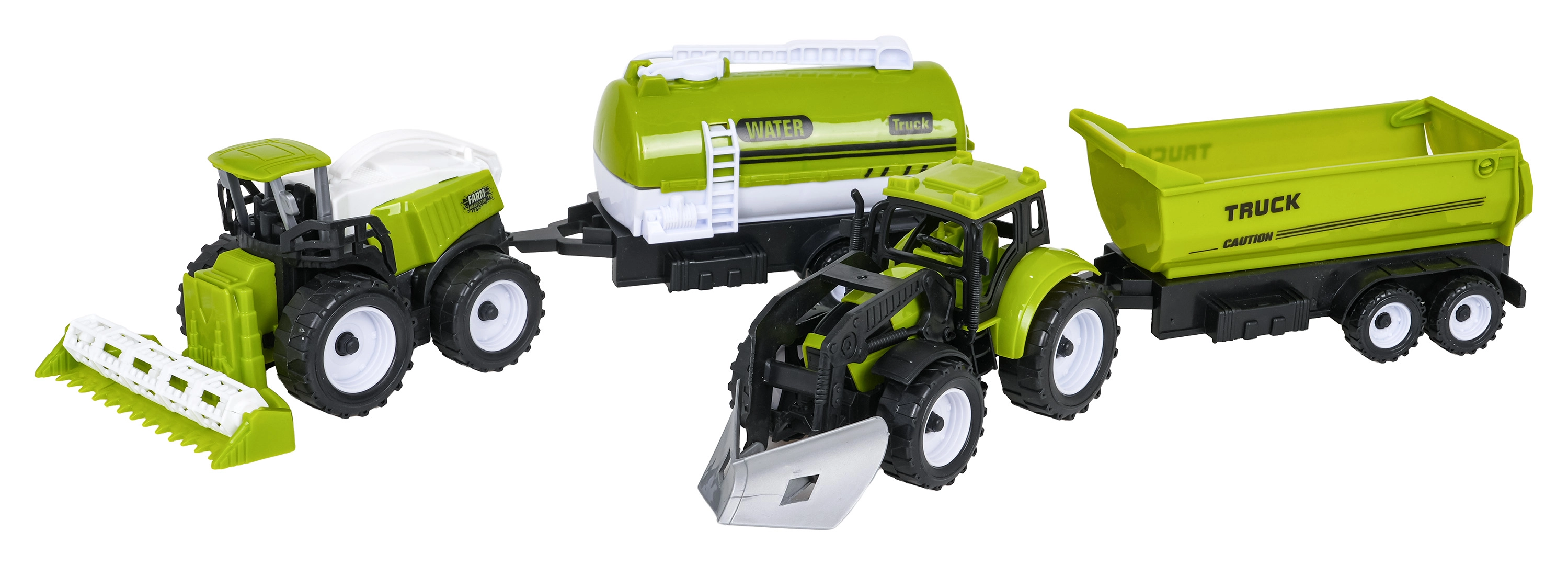 Traktor s plugom, kombajn, prikolica in cisterna. Vse je mogoče medsebojno povezovati za še več igralnih scenarijev.