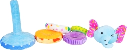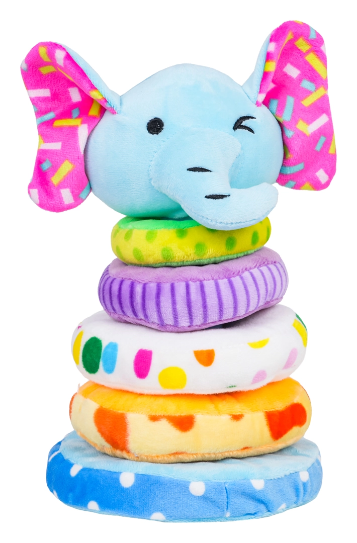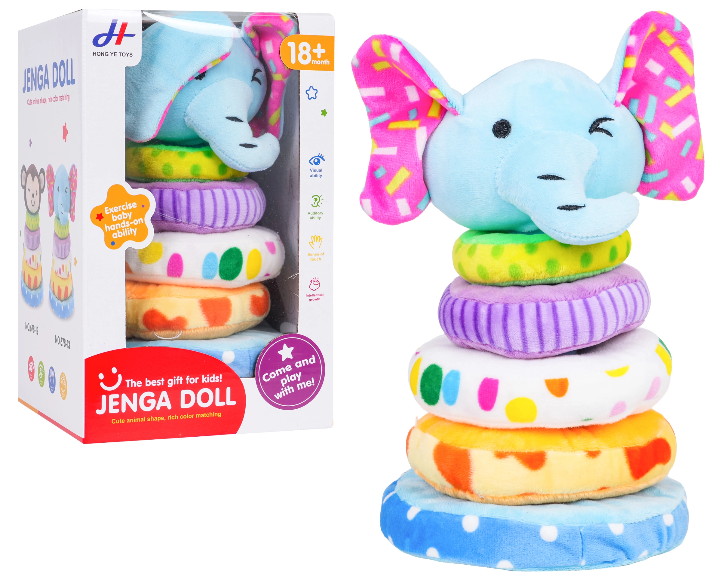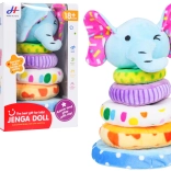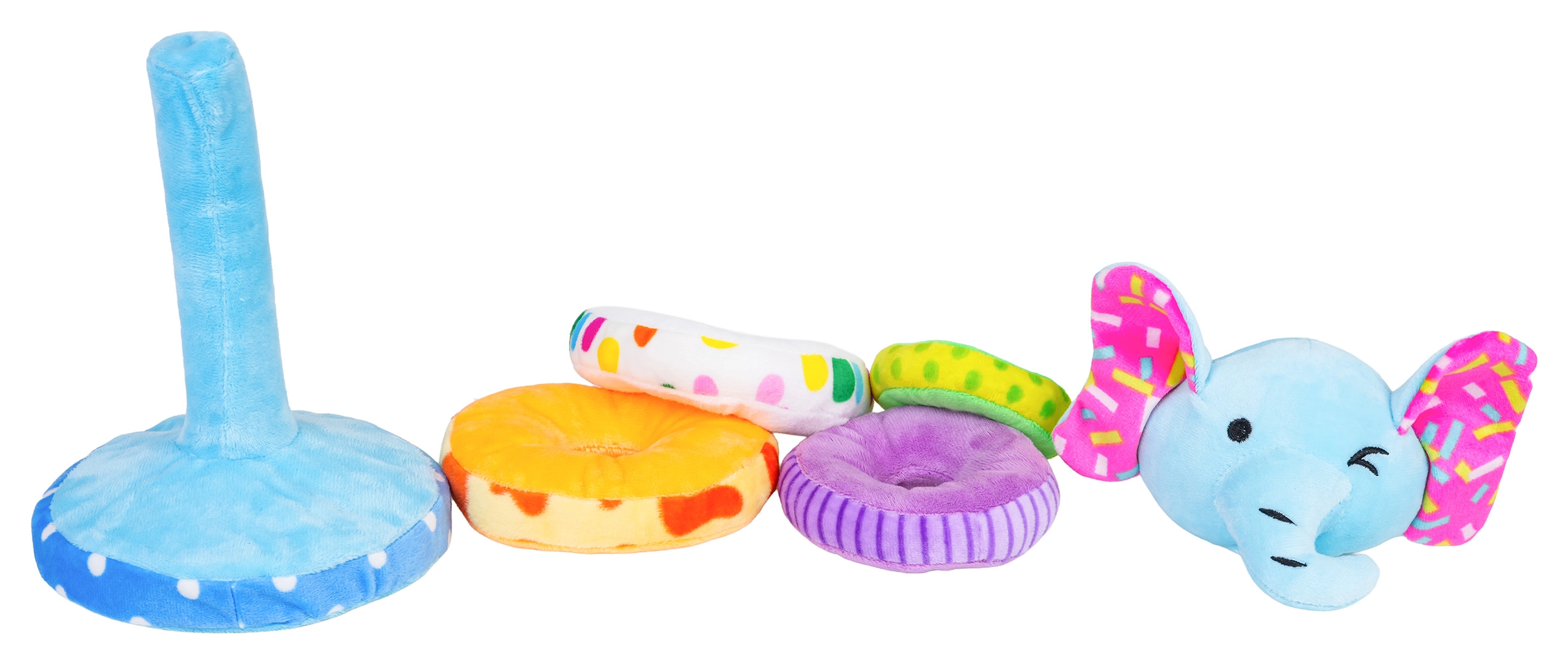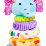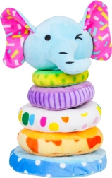 Ta mehka plišasta piramida v obliki slona je odlična prva izobraževalna igrača. Otroci vadijo natikanje 4 obročkov različnih velikosti na mehki trn in se učijo razvrščanja po velikosti in barvah. Piskalo v slončkovi glavi nagradi vsak pritisk z veselim zvokom ter razvija slušno zaznavanje.