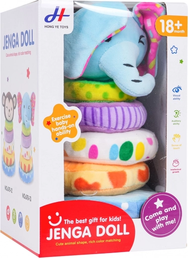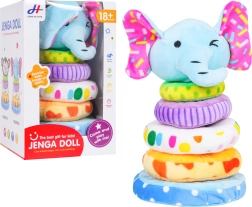 Prisrčna in varna igrača za otroke od 18 mesecev: mehka zložljiva piramida s slonom iz prijetnega pliša. Spodbuja fino motoriko, koordinacijo oko–roka, razlikovanje barv in velikosti ter z vgrajeno piskajočo slonovo glavo motivira k odkrivanju. Žive barve in vzorci pritegnejo pozornost, mehka izvedba je idealna za varno igro.