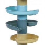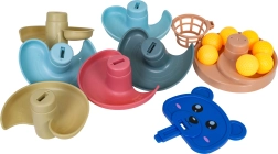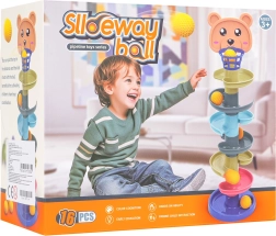 Žogice gladko drsijo po več nadstropjih, otroci pa spremljajo njihov gib od koška do zbirne baze. Odlična vizualno-motorična aktivnost.