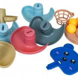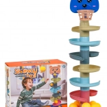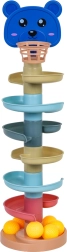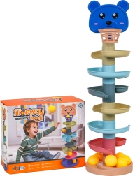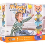 Ta barvita kroglična steza z medvedjo glavico in zgornjim koškom navduši male graditelje in radovedne ročice. Deli se preprosto zaskočijo, zgradite stolp do 6 nadstropij in opazujte, kako žogice švigajo po spiralnih tirih navzdol do baze. Višji kot je stolp, večji je izziv zadeti košek – odlična igra za razvoj potrpežljivosti in koncentracije.