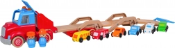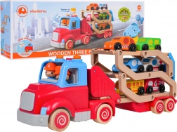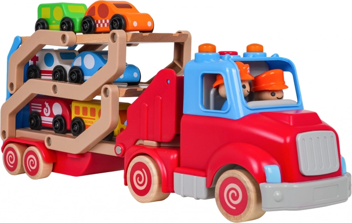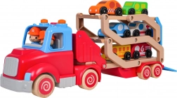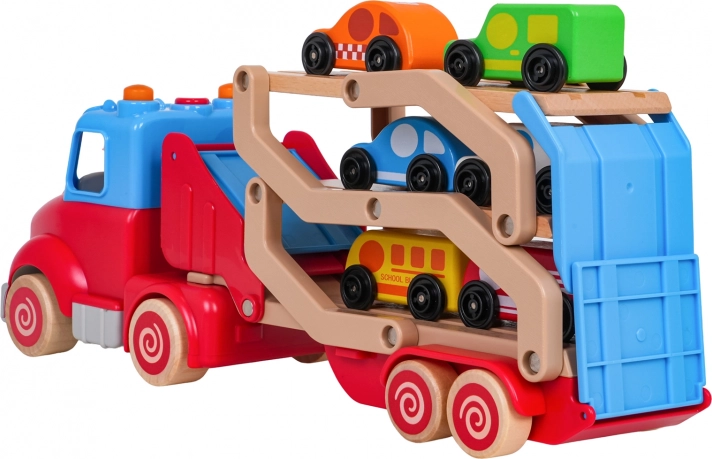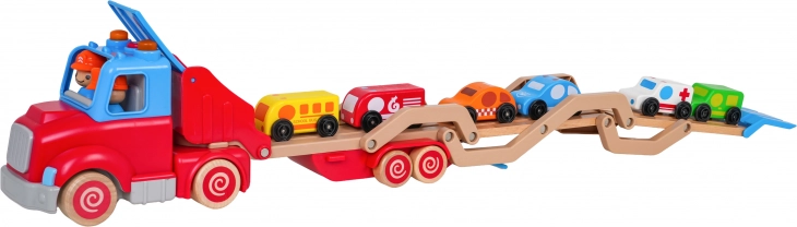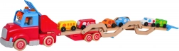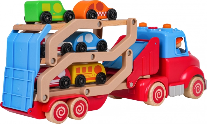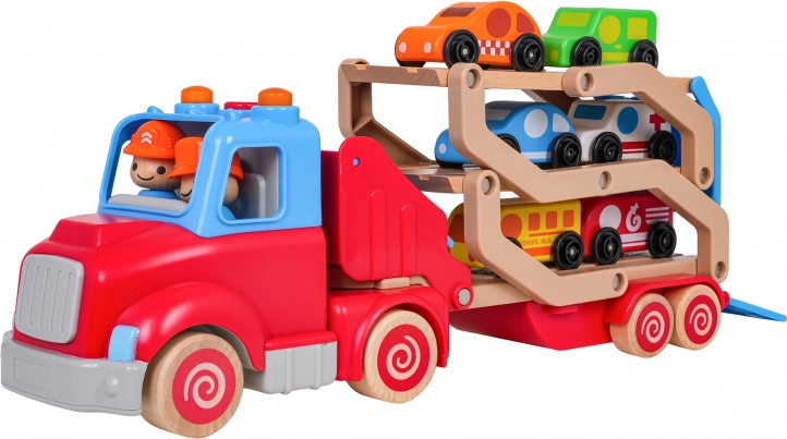 Ta leseni tovornjak z vlečno rampo podpira fino motoriko, koordinacijo in domišljijo. Zaradi živih barv in funkcionalnih elementov – dvižna in preklopna rampa, odklopljiva garnitura, kolesa za vožnjo – otroci zlahka obvladajo nakladanje in razkladanje avtomobilčkov ter si izmišljajo lastne prometne zgodbe.