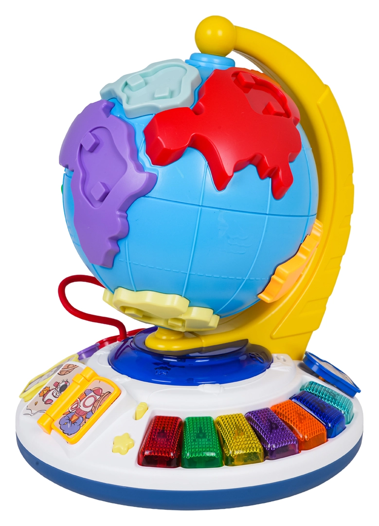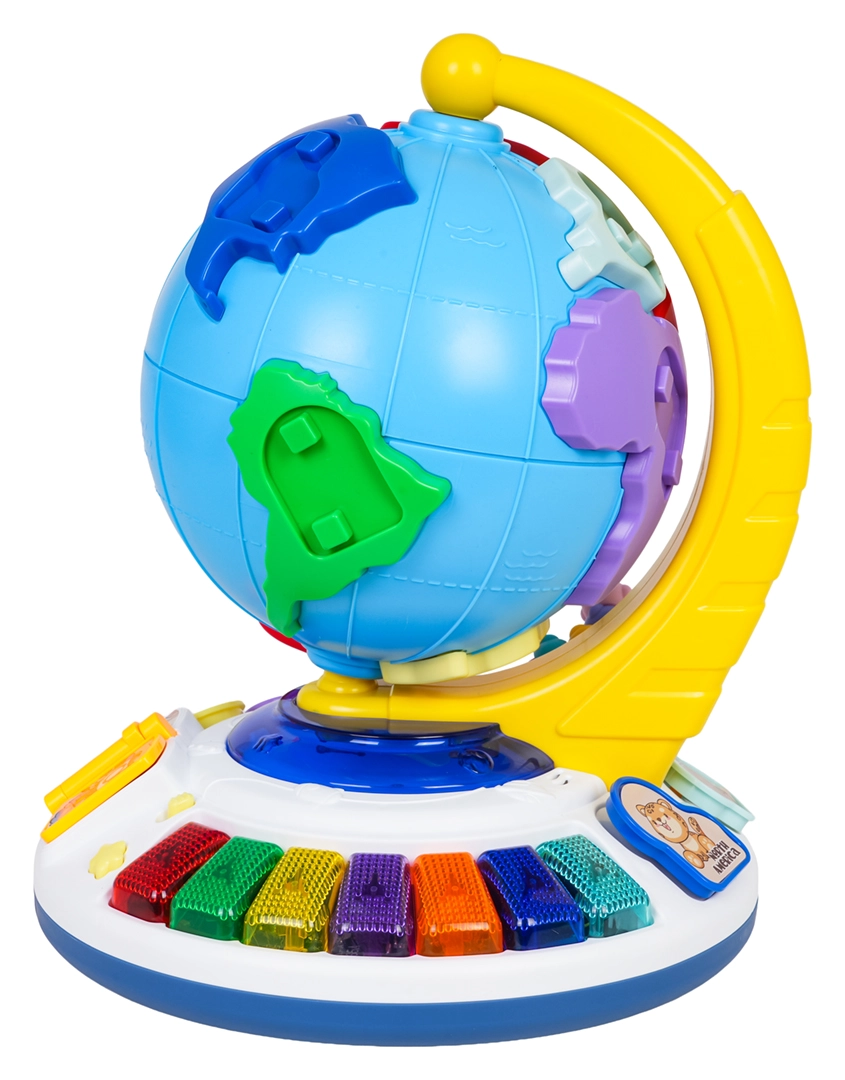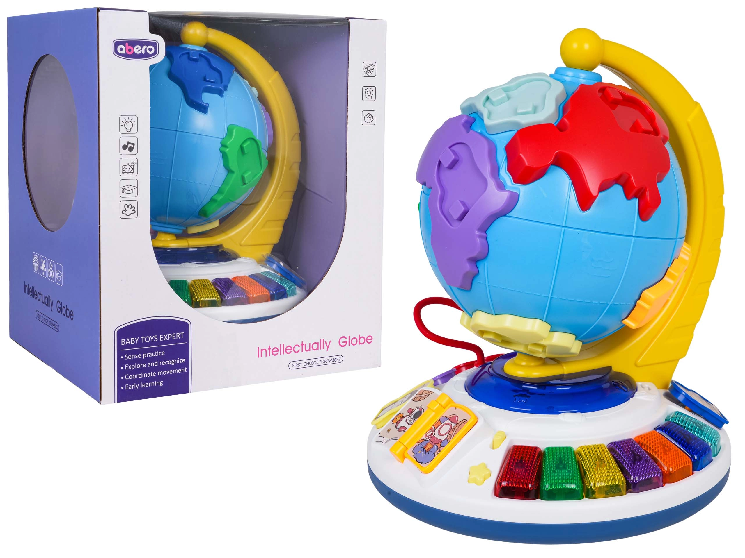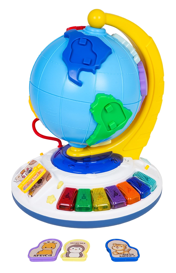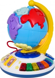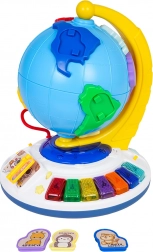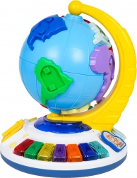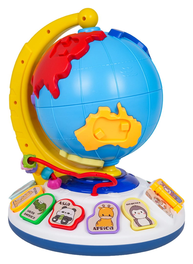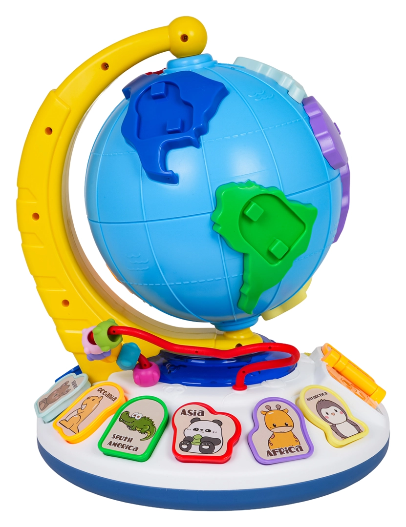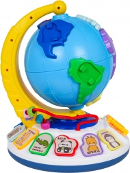 Globus se prosto vrti na stabilnem podstavku. Preklopna knjižica sproža melodije, kroglična steza pa vadi fino motoriko.