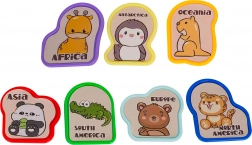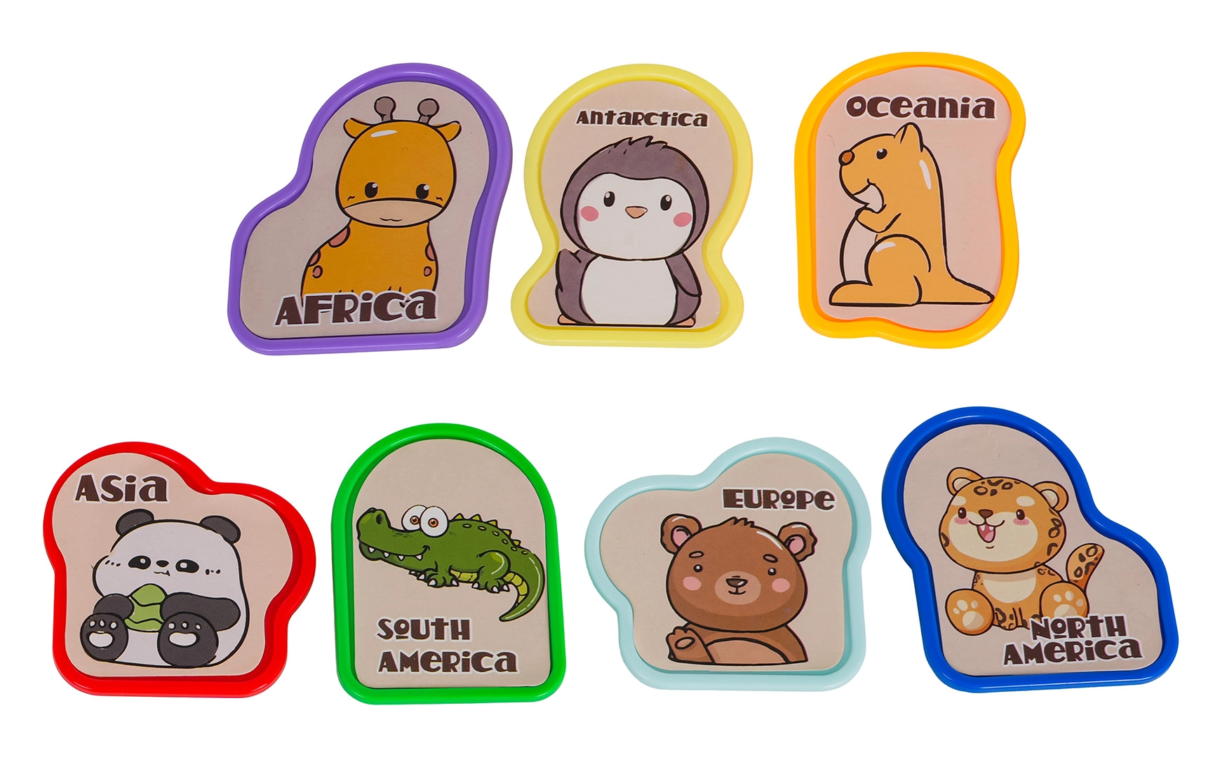 V kompletu je 7 kontinentov in 7 priponk z živalmi. Po vstavitvi priponke se oglasi ime kontinenta, živali in njen značilen zvok – učenje, ki zabava.