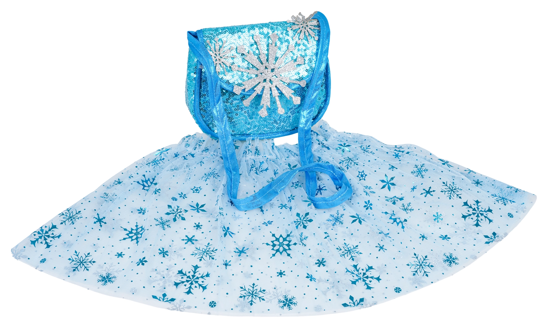 Lahkotno tilasto krilce s snežinkami in ujemajoča se bleščeča torbica ustvarita popoln ledeni videz za vsako malo princesko.