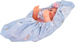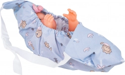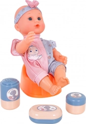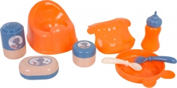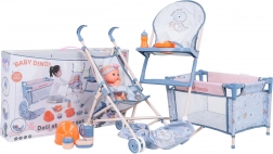 - punčka, potovalna posteljica, voziček, hranilni stolček, nosilka, kahlica, krožniček, žlička, vilica, steklenička, škatlica za kremo, škatlica za puder, milnica, slinček