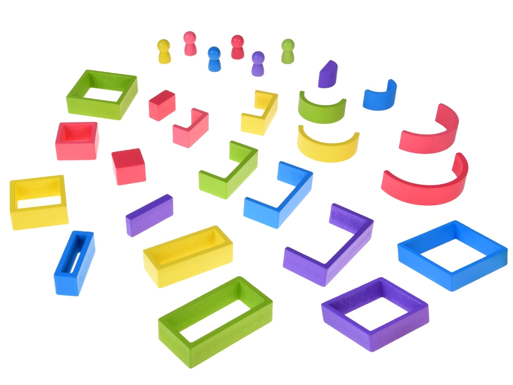 Lokoví, okvirji, mostovi in druge oblike se lahko zlagajo, vstavljajo in uravnotežajo. Otroci urijo fino motoriko, učenje pa poteka naravno skozi igro.