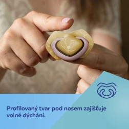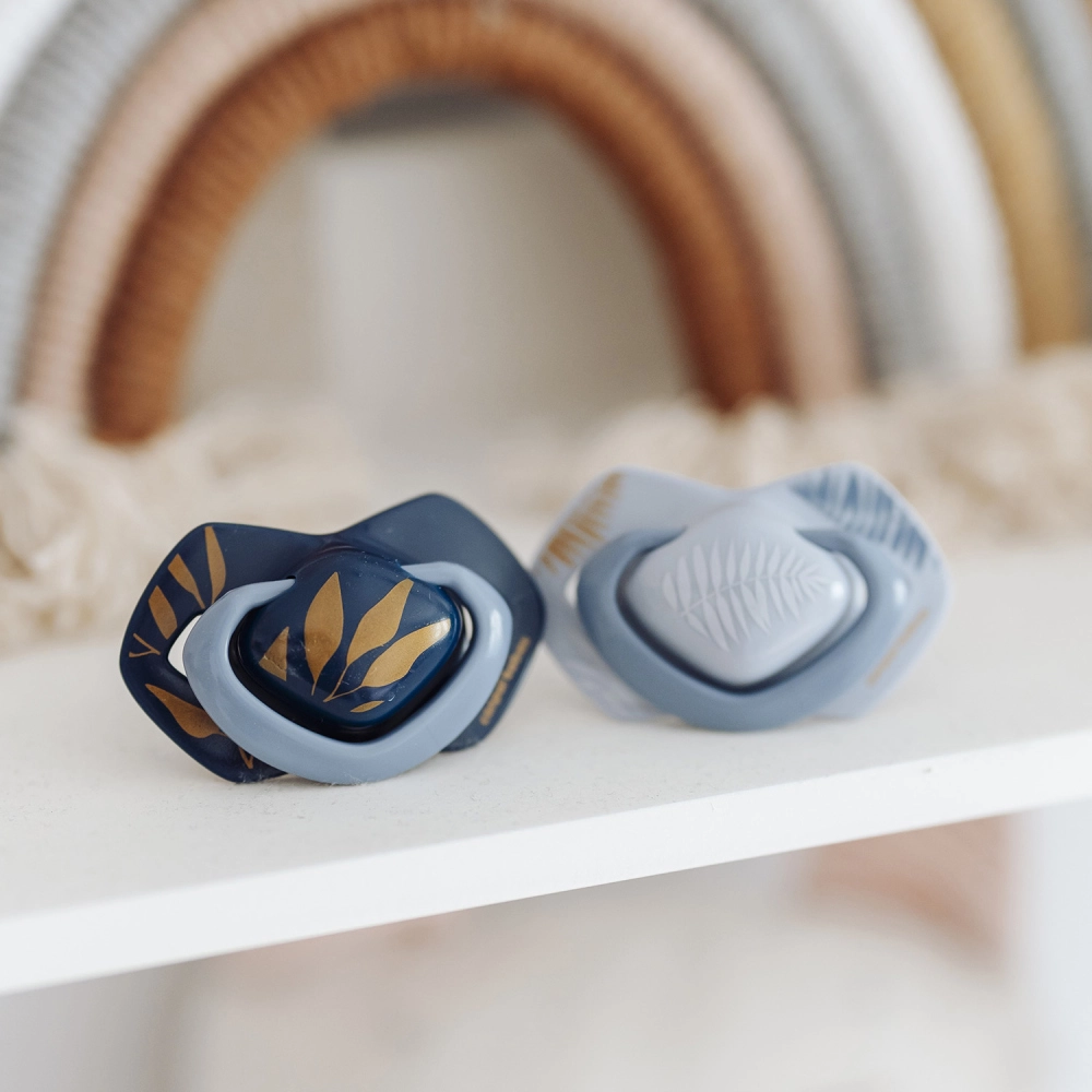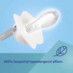 Simetrična konica se naravno prilagodi ustom ne glede na položaj, podpira pravilen razvoj ustne votline in udobno sesanje.