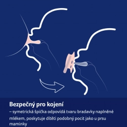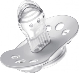 Homogeni silikon se med sesanjem ritmično krči in razteza. Sploščena, simetrična oblika podpira pravilno delo jezika in prosto zapiranje ust.