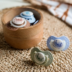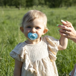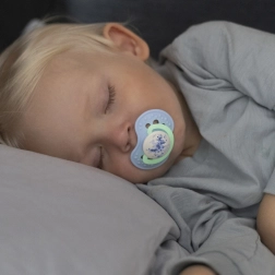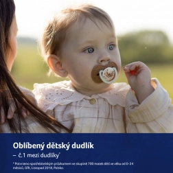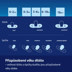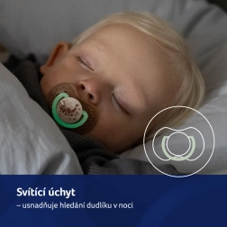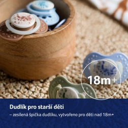 Za starejše otroke (18m+) je dudek opremljen z okrepljeno silikonsko konico, bolj odporno proti grizenju. Svetleč ročaj zagotovi hitro najdbo ponoči. Materiali so brez BPA, brez okusa in vonja, primerni za občutljive dojenčke. Priložen je praktičen etui za higiensko shranjevanje.