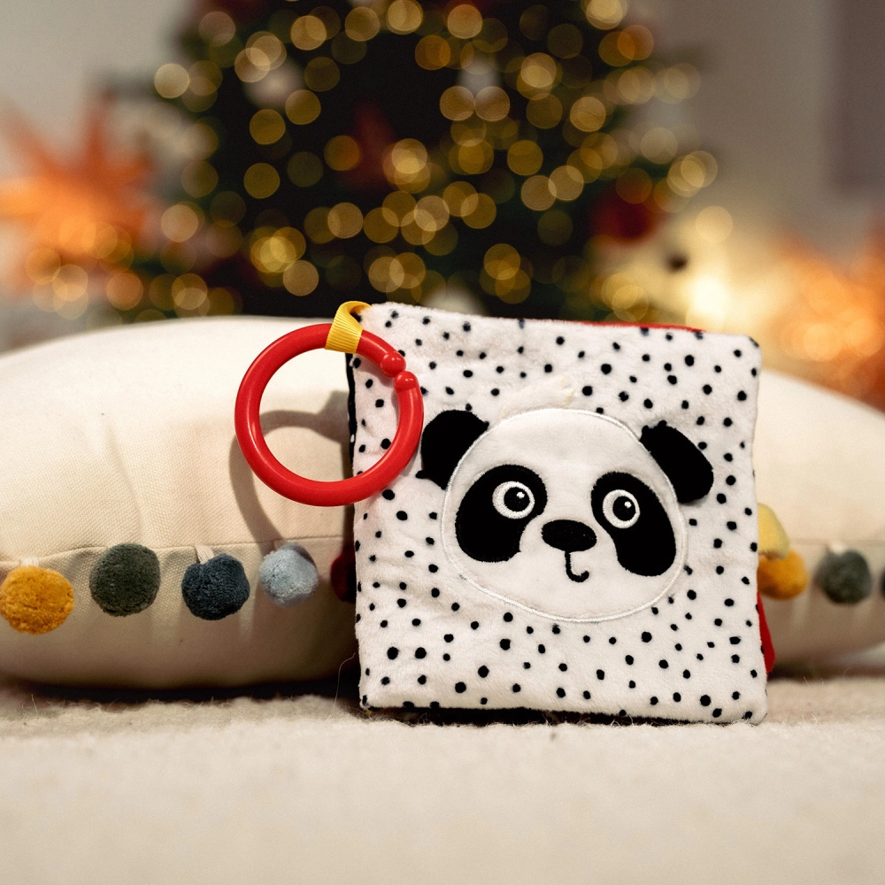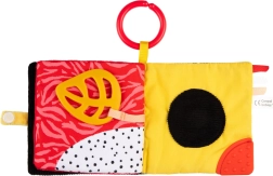 Ta lahka in praktična tekstilna knjižica spodbuja naravni razvoj otroka – aktivira vid, sluh in tip ter podpira koordinacijo oko–roka. Visok kontrast barv pritegne že novorojenčka, mehke teksture in trakci vabijo k raziskovanju, grizalo pa olajša nelagodje pri izraščanju zob.