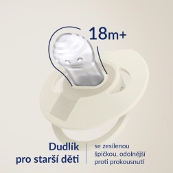 Ergonomično oblikovan in prezračen ščit olajša dihanje skozi nos, zmanjšuje stik s kožo in omejuje tveganje za draženje. Duda je izjemno lahka, se v ustih ne deformira in ne vpliva negativno na zdrav razvoj ugriza in govora*. Del pakiranja je praktično sterilizacijsko ohišje za higiensko shranjevanje in enostavno razkuževanje v mikrovalovni pečici.
