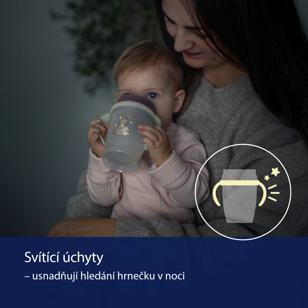 Ergonomski, svetleči ročaji se odlično prilegajo majhnim rokam in olajšajo najdbo lončka ponoči. Vse dele je mogoče enostavno razstaviti in umiti. Lonček ni zasnovan kot popolnoma nekapljičen pri močnem tresenju ali padcu, kar otroka spodbuja k boljši kontroli gibov med pitjem in ga pripravlja na pitje iz odprtega kozarca.