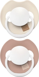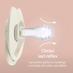 Ergonomsko oblikovan ščit z izrezom sprošča področje nosu, podpira prosto dihanje in zahvaljujoč zračnim odprtinam zmanjšuje tveganje draženja kože. Dudek je zelo lahek, ne obremenjuje ugriza in se ne deformira v ustih zaradi kakovostnega silikona. Svetleči elementi olajšajo nočno iskanje, elegantni brezčasni barvi Ivory/Blush pa se odlično podata k opremi za dojenčka.
