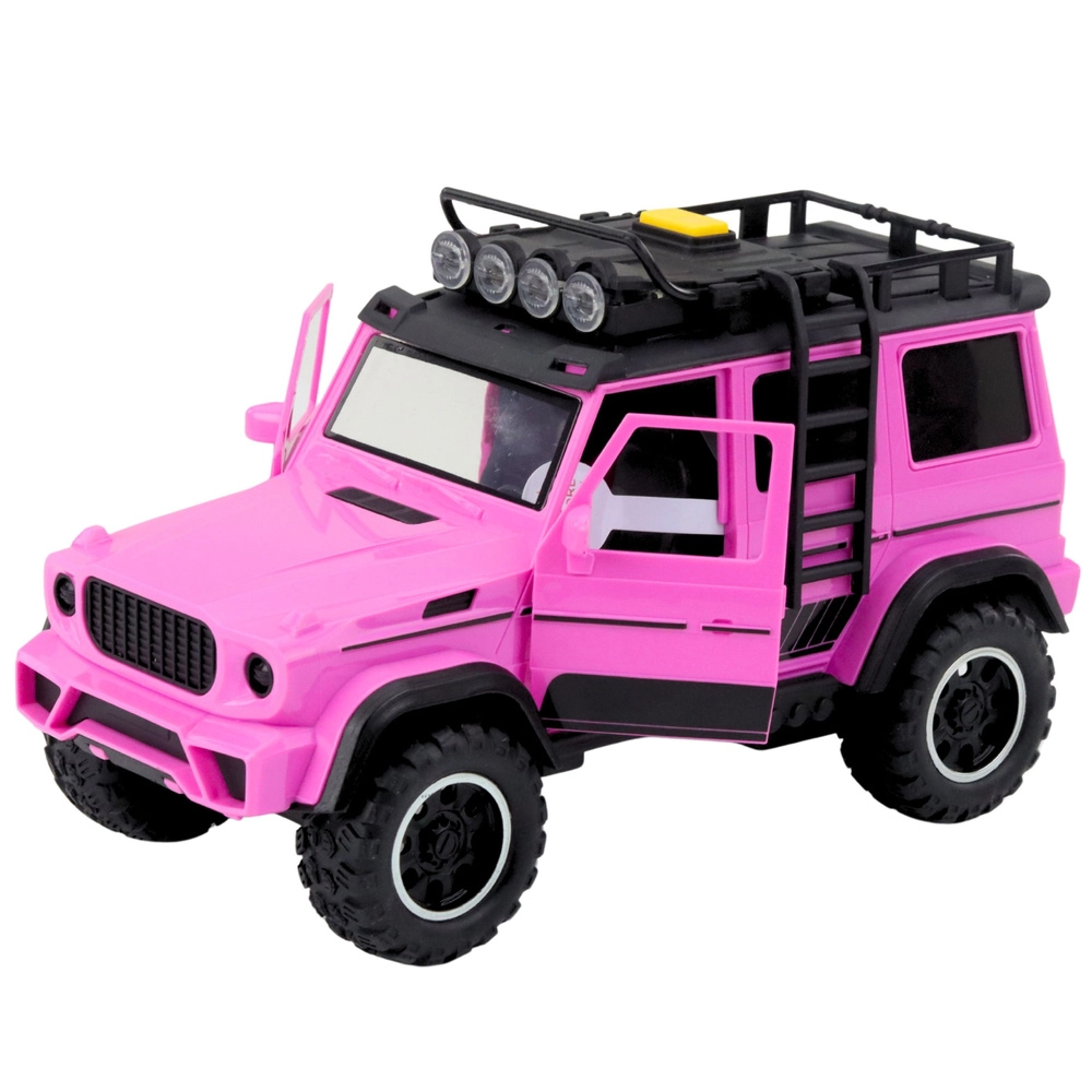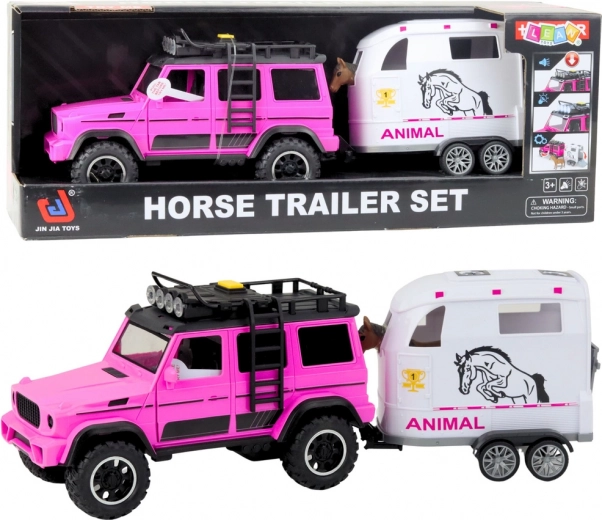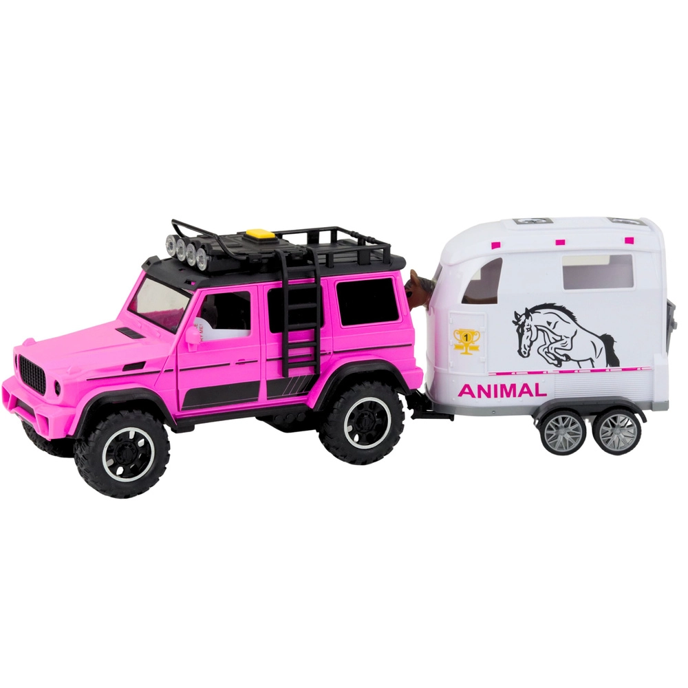 Odkrijte realističen igralni set, ki združuje robustno terensko vozilo in prikolico za konje. Zaradi podrobne izdelave, kakovostne plastike in privlačne rožnato-bele barvne kombinacije igra deluje avtentično ter spodbuja ustvarjalnost in fino motoriko.