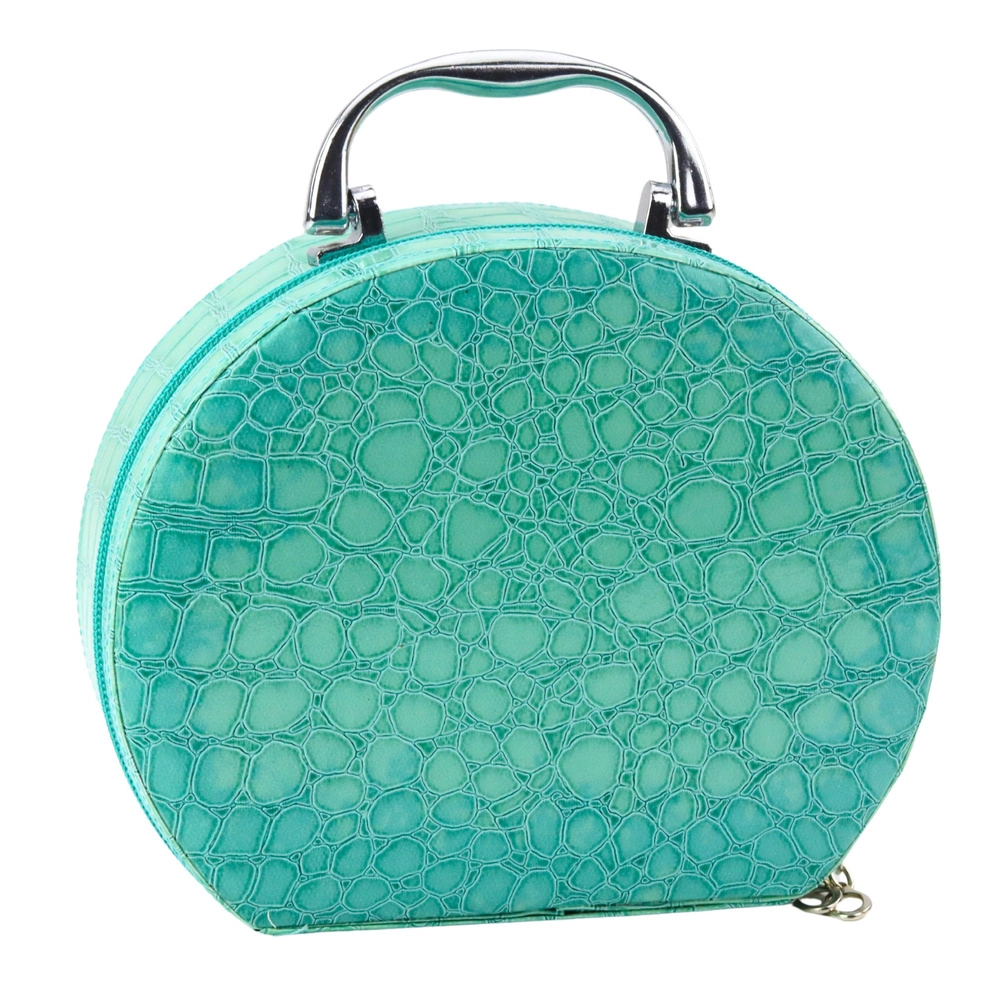 Okrogla turkizna kozmetična torbica s kovinskim ročajem in zadrgo varno hrani vse dodatke in jih ohranja vedno pri roki – idealno za doma in na potovanju.