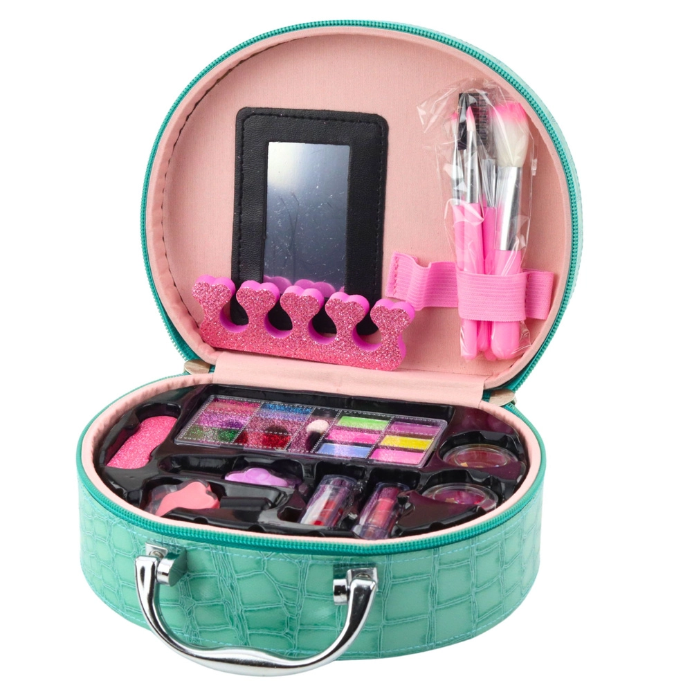 Stilski otroški kozmetični komplet v elegantni turkizni torbici z reliefom »krokodilje kože« ponuja vse za varno in ustvarjalno igro lepotnega salona. Vključuje paleto bleščečih senčil in bleščic, lake za nohte, glosse/balzame za ustnice, čopičke, čolničke s konfeti, pilico, separator in zrcalce. Kompaktni kovček z ročajem je idealen za na pot, zabave in vsakodnevno igro.