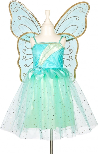 Čaroben vilinski kostum v turkiznih tonih bo navdušil vsako malo ljubiteljico pravljic. Obleka klasičnega kroja se preprosto obleče čez glavo in se zaradi elastičnega pasu lepo prilega. Sprednji del krasita zlat prešit vzorec in bleščeč našitek, v pasu pa so nežni cvetovi in listi z zlatim robom za resnično pravljičen videz.