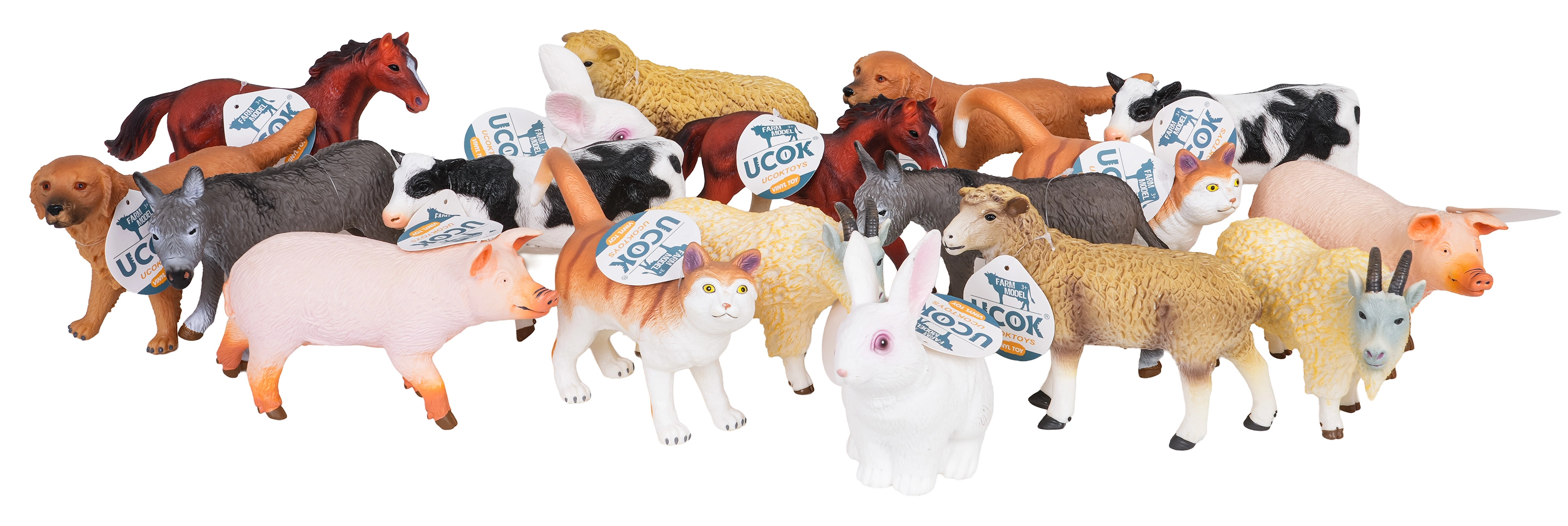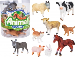 V pakiranju najdete raznolik izbor kmečkih živali, vključno s konjem, kravo, prašičem, kozo, ovco, oslom, psom, mačko in zajcem – vedno po dva kosa, da se lahko otroci zlahka igrajo v parih ali ustvarijo majhno “čredo”. Praktični tulec/škatla omogoča red in enostavno prenašanje, zato je set primeren za dom, vrtec in na pot.