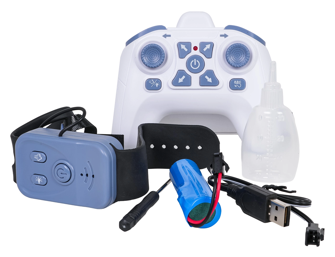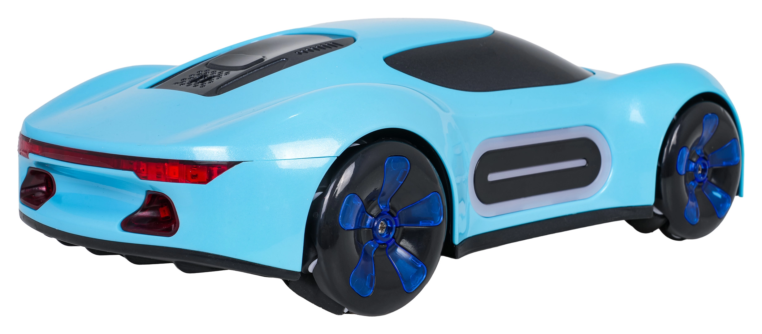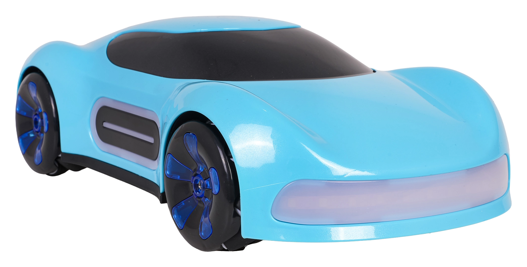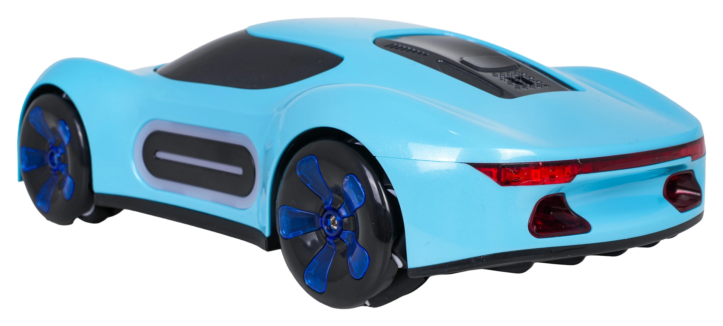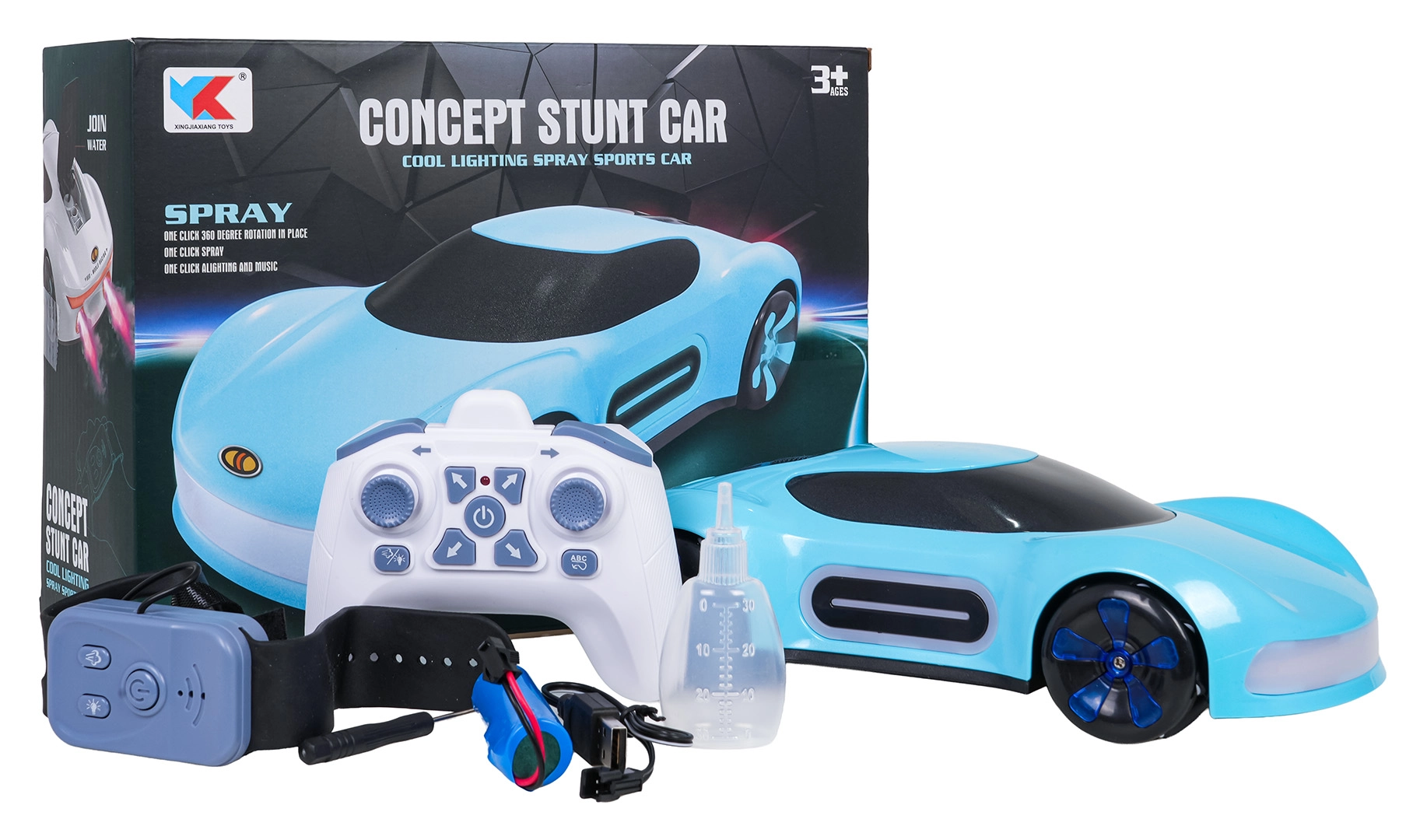 Avto obvlada vožnjo naprej/nazaj, obračanje desno/levo, bočni pomik, drift in 360° obrate. Upravljanje je intuitivno – izberite med ročnim upravljalnikom ali gestami na uri. Priložen je polnilni akumulator 3,7 V in USB kabel za enostavno polnjenje.
