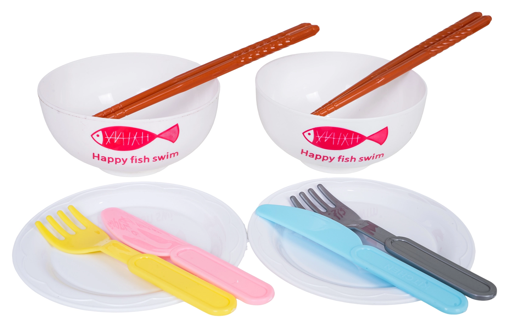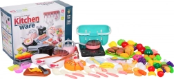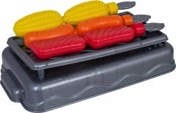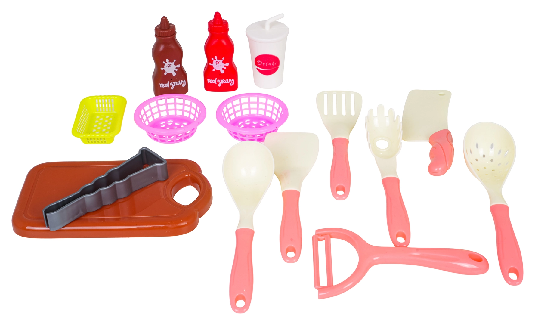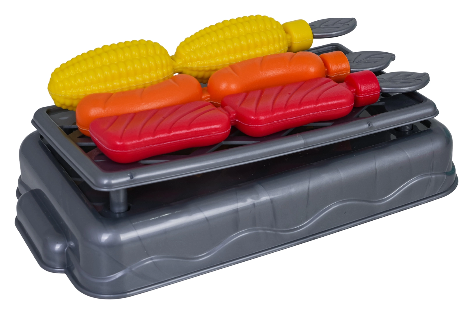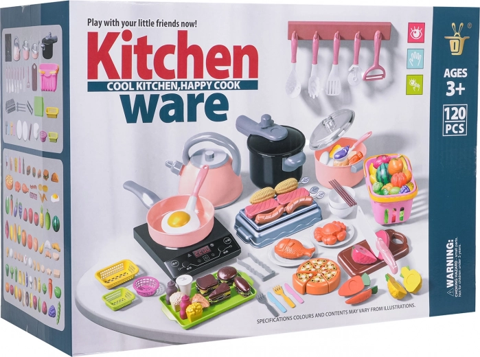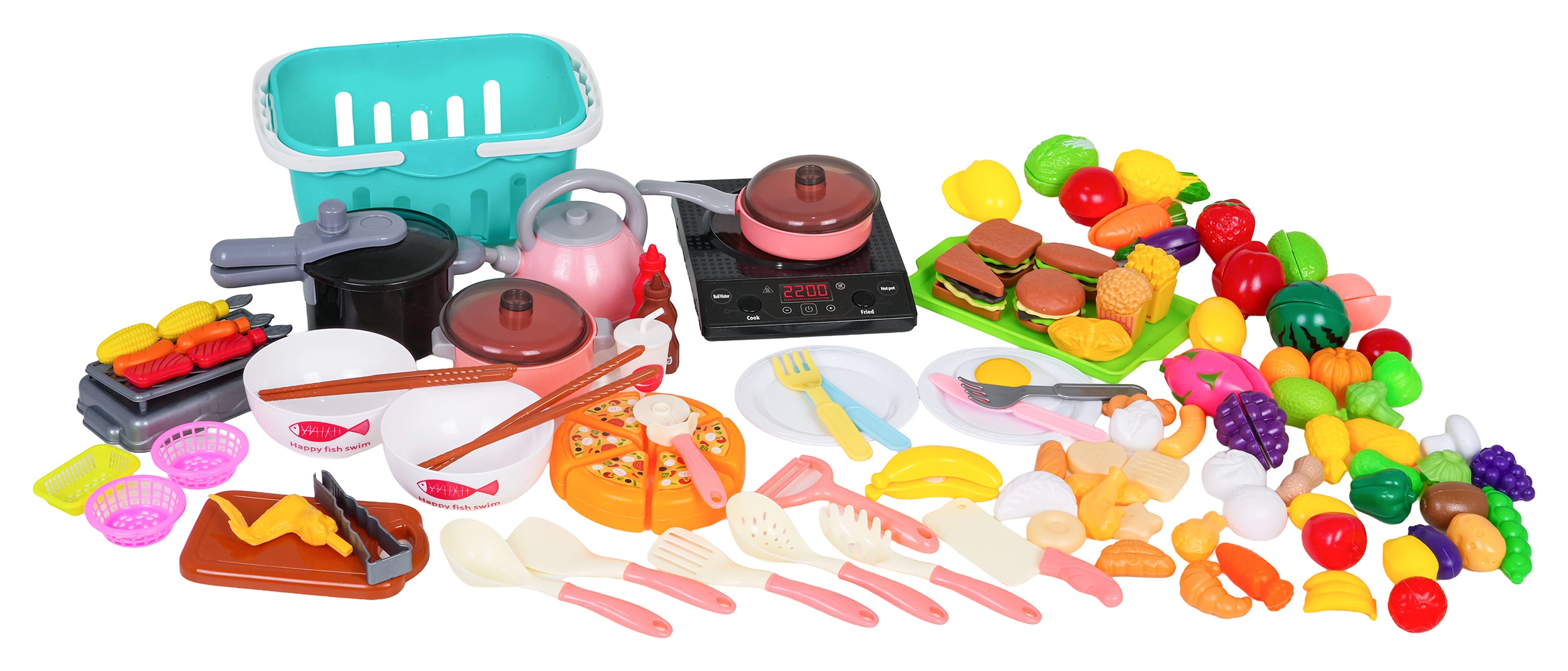 Del kompleta je indukcijska kuhalna plošča na 3× AA (niso priložene), ki prikazuje temperaturo in ima na dotik upravljanje; ne manjka žar, komplet posode (igrača električni grelnik vode, lonec na pritisk, ponev, lonec), servirni seti (sklede, krožniki, jedilni pribor, palčke), živila za rezanje na ježka, pica z rezalnikom, nabodala in mnogo več. Vse dopolnjujeta nakupovalna košarica in servirni pladenj za realistično igro.