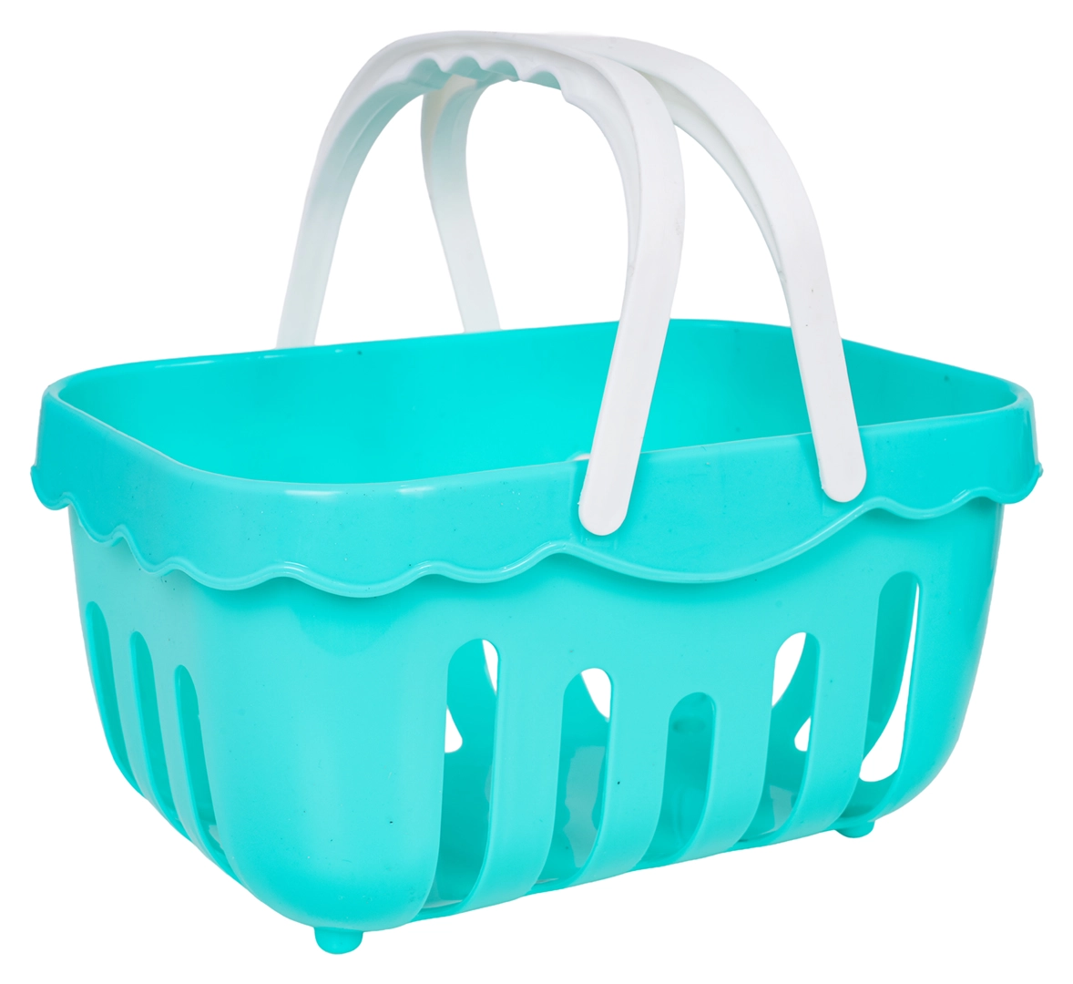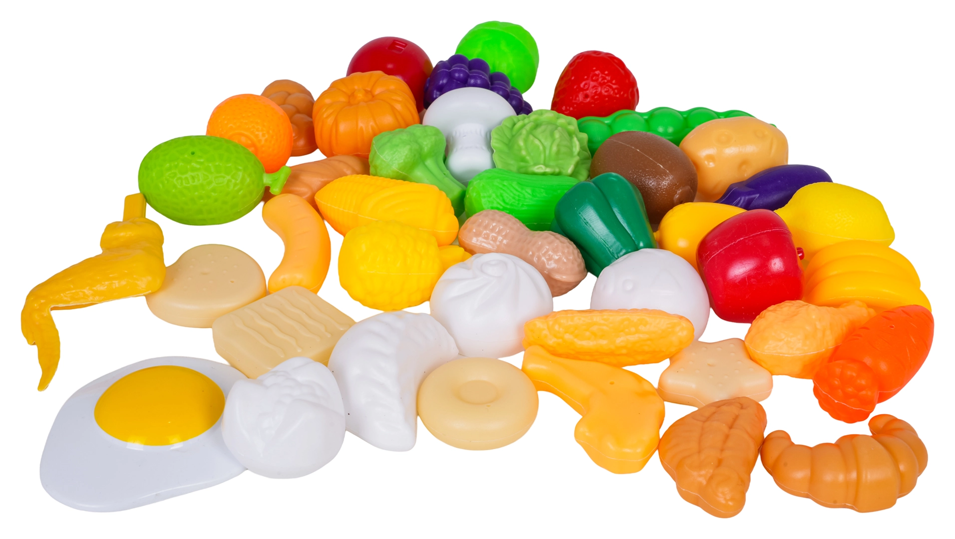 Velika nakupovalna košarica in pestra zbirka sadja ter zelenjave, vključno s kosi na ježka, učita prepoznavanja živil in urita fino motoriko pri rezanju.