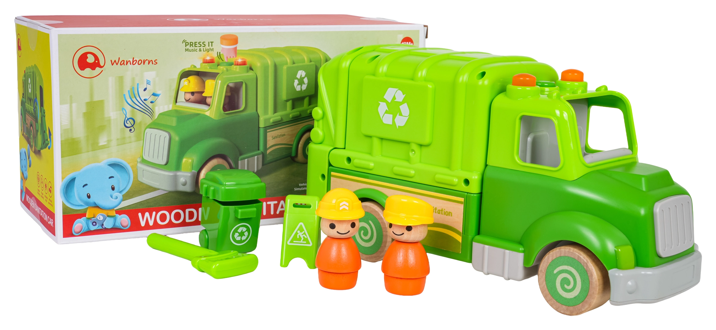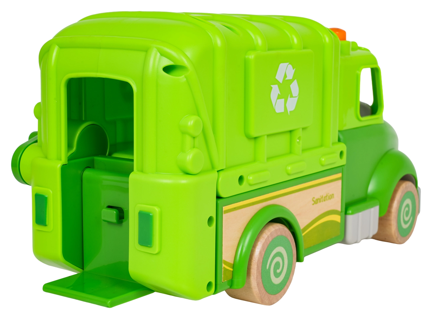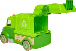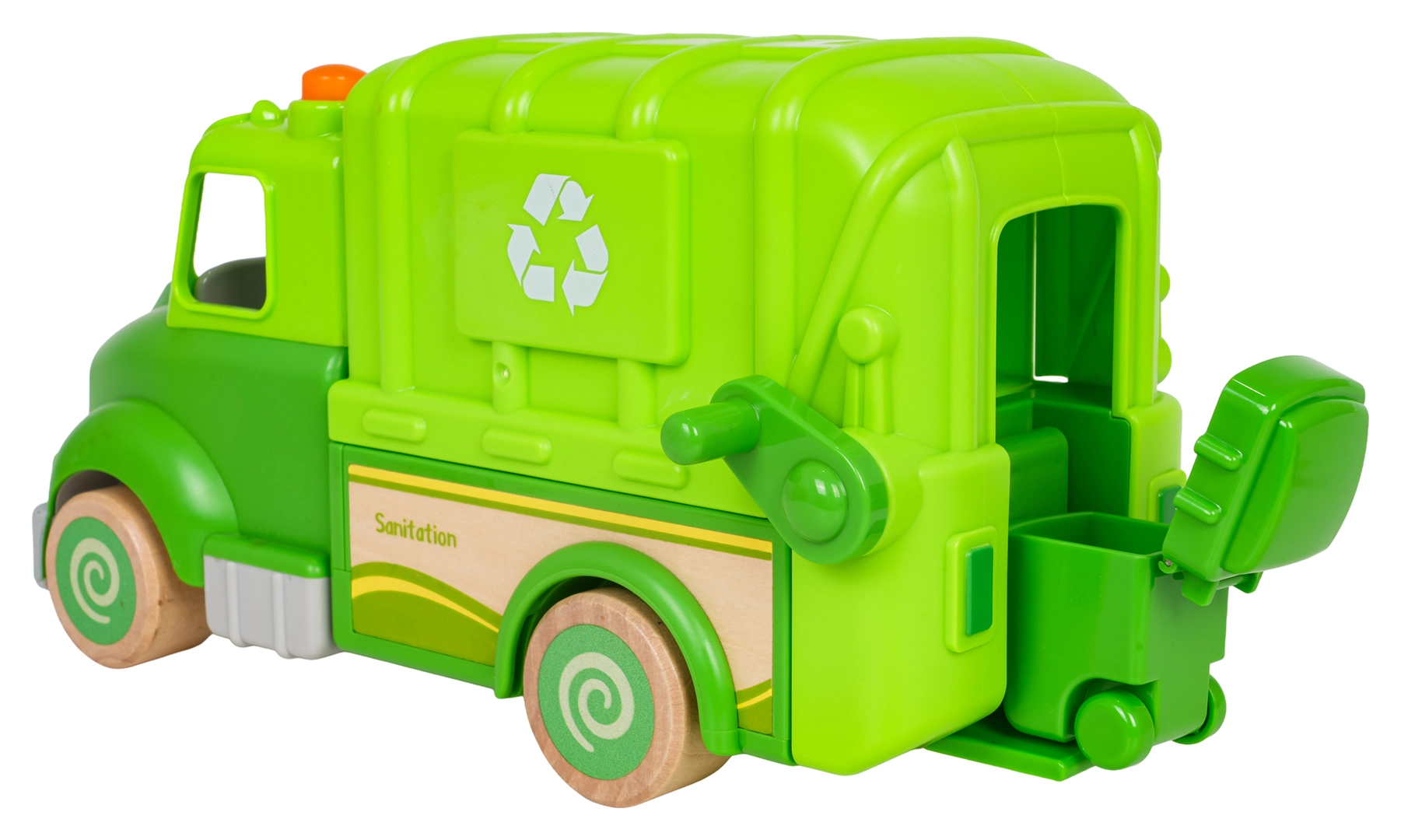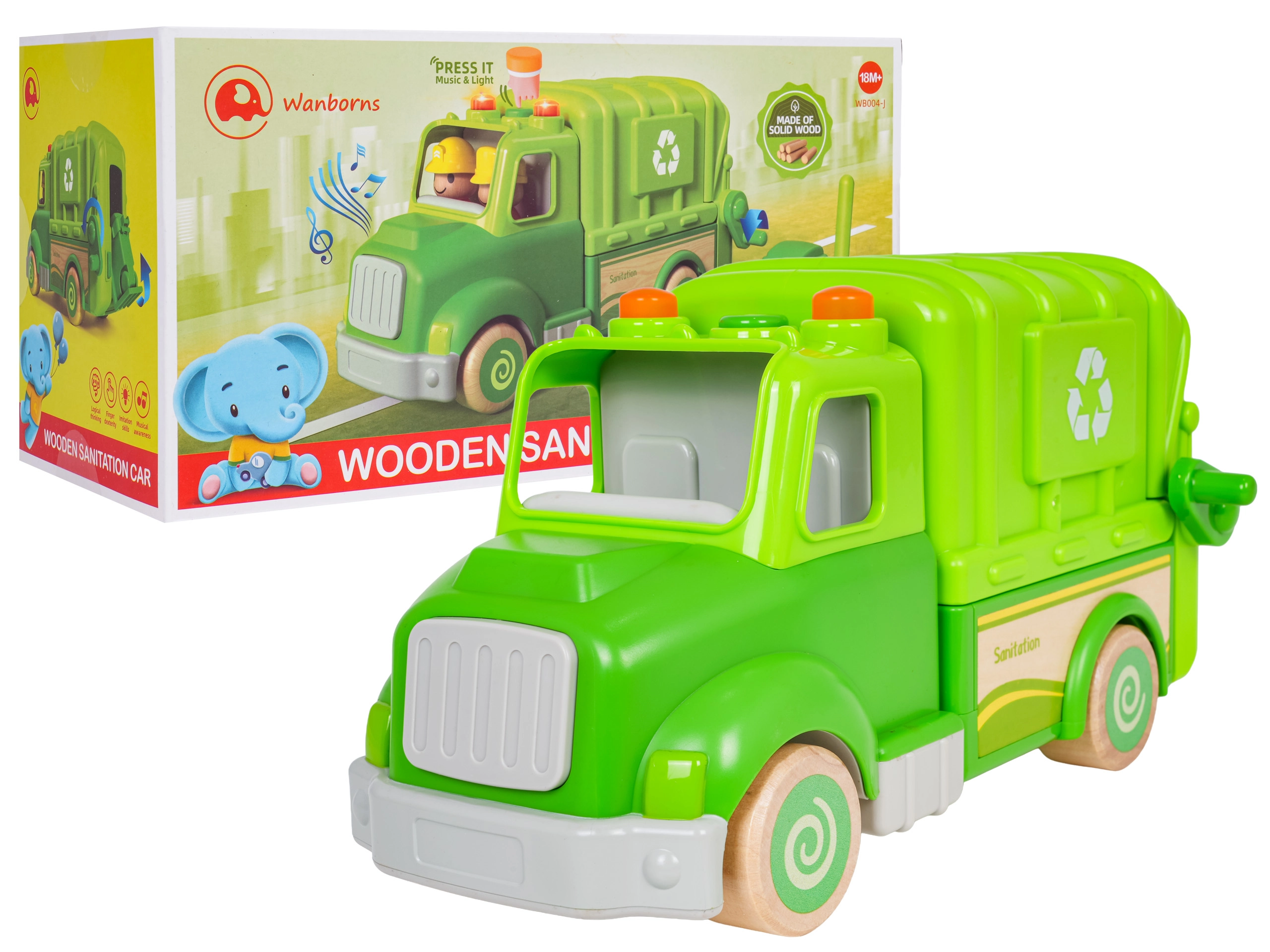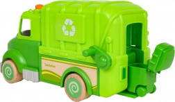 Ta zeleni smetarski tovornjak je zasnovan za varno in ustvarjalno igro. Zaobljene oblike, lesena kolesa in trdna konstrukcija iz lesa in plastike ga naredijo za idealno igračo za otroke. Na strehi je gumb, ki zažene melodije, zvoke vožnje, zagona in hupo, dopolnjene z utripajočimi lučkami.