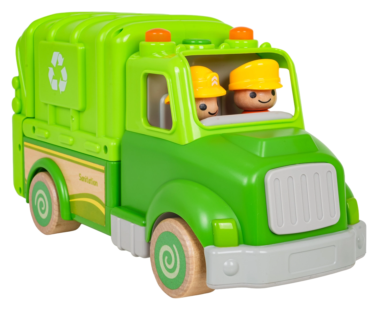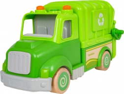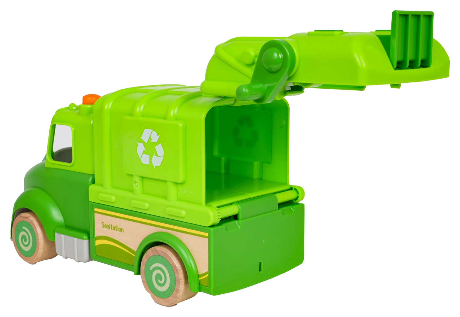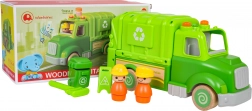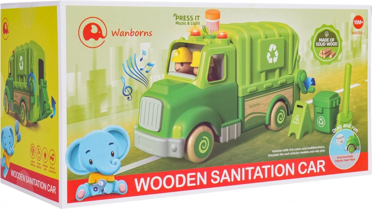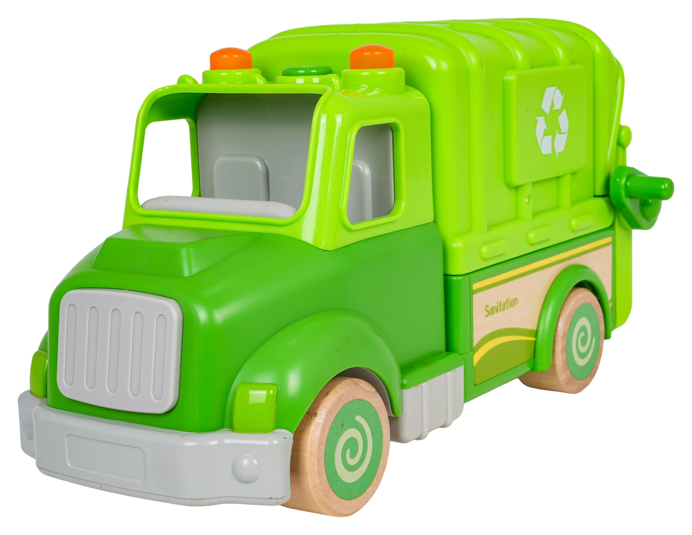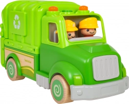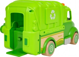 Ta zeleni smetarski tovornjak je zasnovan za varno in ustvarjalno igro. Zaobljene oblike, lesena kolesa in trdna konstrukcija iz lesa in plastike ga naredijo za idealno igračo za otroke. Na strehi je gumb, ki zažene melodije, zvoke vožnje, zagona in hupo, dopolnjene z utripajočimi lučkami.