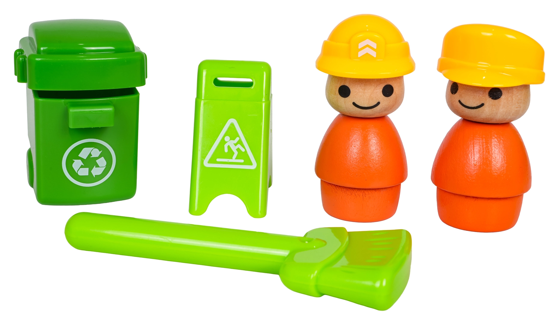 V kompletu sta 2 figurici, koš za odpadke, opozorilni znak in metla. Vse v varni izvedbi z živimi barvami.