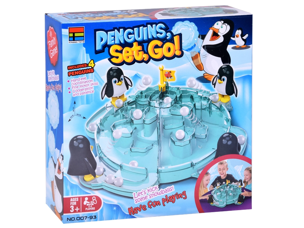 Zabavna družinska igra s prikupnimi pingvini, v kateri odločajo hitri refleksi, natančnost in pravilno časovno usklajevanje. Pritisni pingvinu na glavo in izstreli snežno kroglico proti ledeni gori – kdor prvi zapolni svoje ploščadke ali zadene vrh z zastavico, zmaga! Idealno za 2–4 igralce in otroke od 3 let.