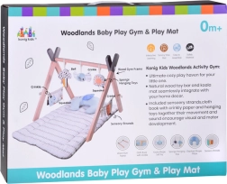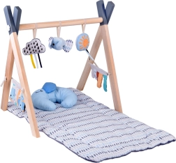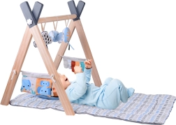 Stilska lesena baby gym dojenčku nudi udoben prostor na trebuščku in na hrbtu, medtem ko mehke viseče igrače vabijo k stezanju, prijemanju in raziskovanju različnih tekstur. Kontrastni elementi, šumeči materiali in piskalke naravno spodbujajo vid, sluh in dotik.