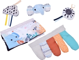 Mehke viseče igrače – oblaček s trakci, sonček in slonček – spodbujajo vizualno zaznavanje, koordinacijo oko–roka in prve prijeme.
