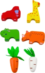 - leseni avto z odstranljivo streho, 6 korenjičkov (pribl. 8 cm), 8 magnetnih hroščkov (pribl. 5,5 cm), 2 figurici z magnetom (pribl. 6,5 cm), 6 živalic za vstavljanko