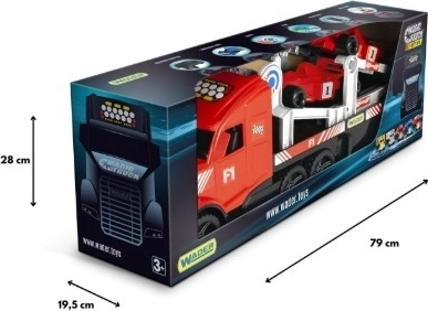 Velik transporter Magic Truck Action Formula 1 bo razveselil vse male ljubitelje motošporta in dirk. Realistično izdelan vlačilec z dolgim polpriklopnikom prevaža dva priložena bolida F1, ki ju lahko preprosto naložite s pomočjo ramp. Polpriklopnik je odklopljiv in ga je mogoče na kabino priključiti na dva načina, kar širi možnosti igre.