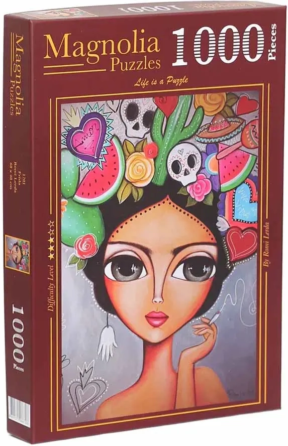 Odkrijte veselje do sestavljanja s sestavljanko s 1000 koščki in ikoničnim motivom Fride. Ta format ponuja prijeten izziv za začetnike in izkušene sestavljavce, po končanem sestavljanju pa nastane dekorativna slika velikosti približno 48 × 68 cm.