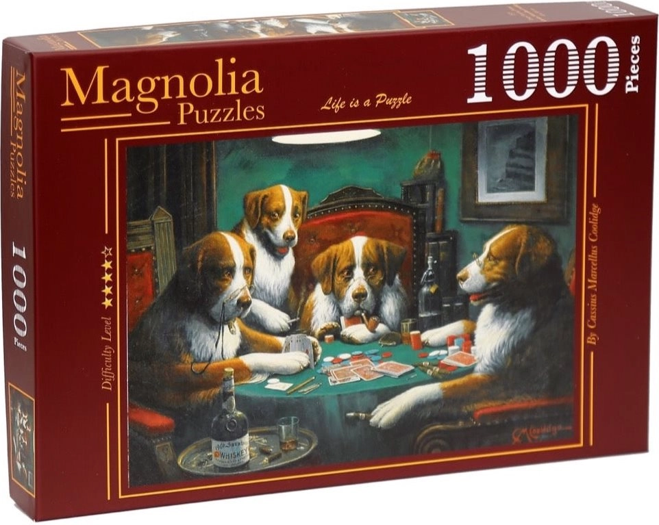 Priljubljen motiv »psi pri pokerju« pride do izraza v večjem formatu in ponuja prijeten izziv tako za začetnike kot za izkušene sestavljavce. 1000 kakovostnih kosov se natančno zaskoči skupaj in ustvari čvrsto, živo obarvano sliko, ki navduši na steni ali v okvirju.