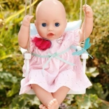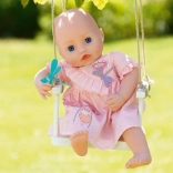 Punčka z realističnimi potezami in velikimi modrimi očmi prinaša zabavo pri igri na gugalnici v naravnem okolju.