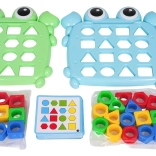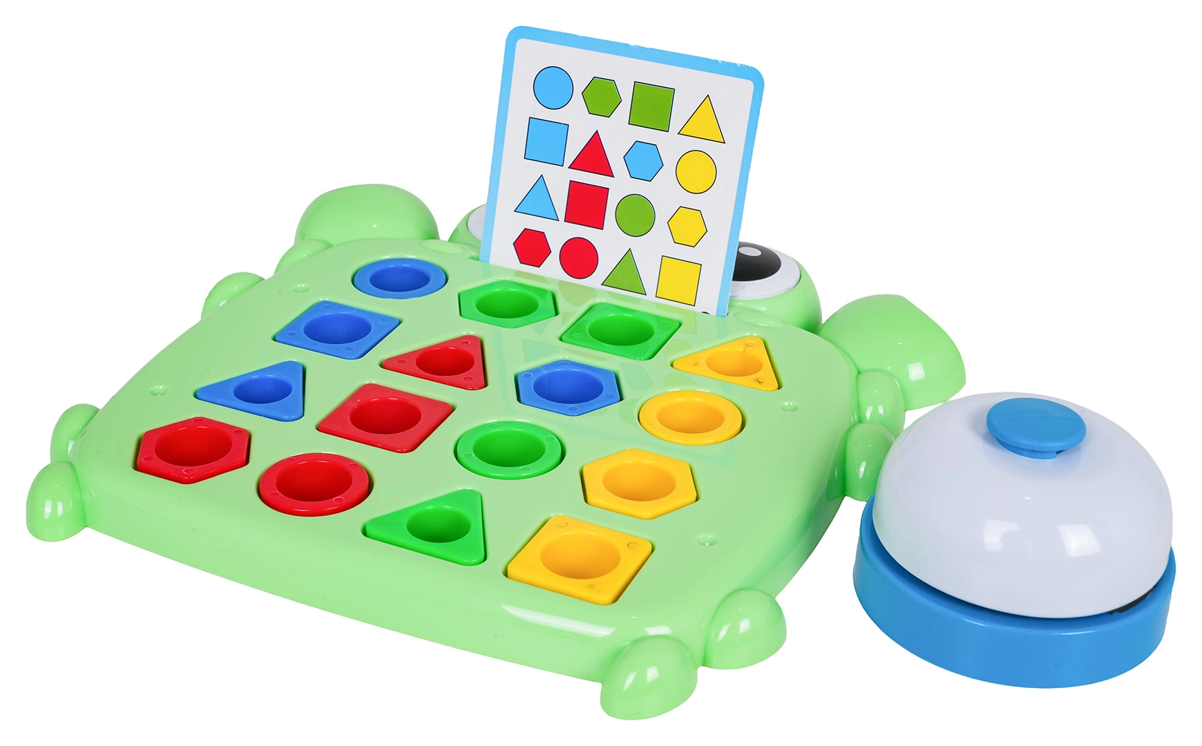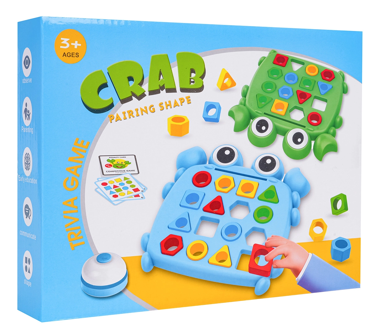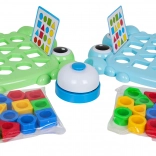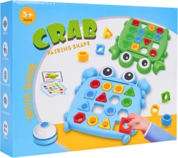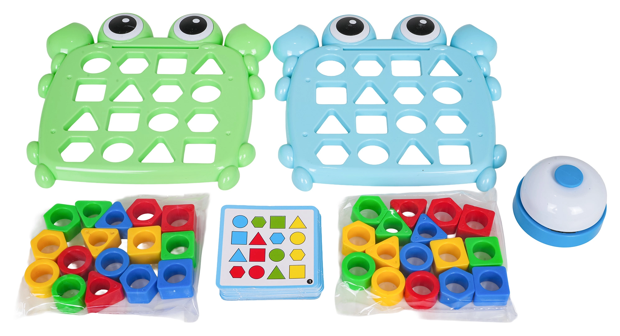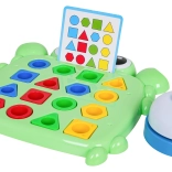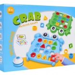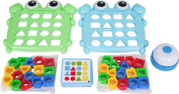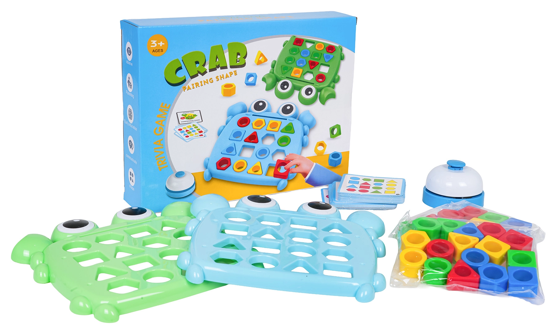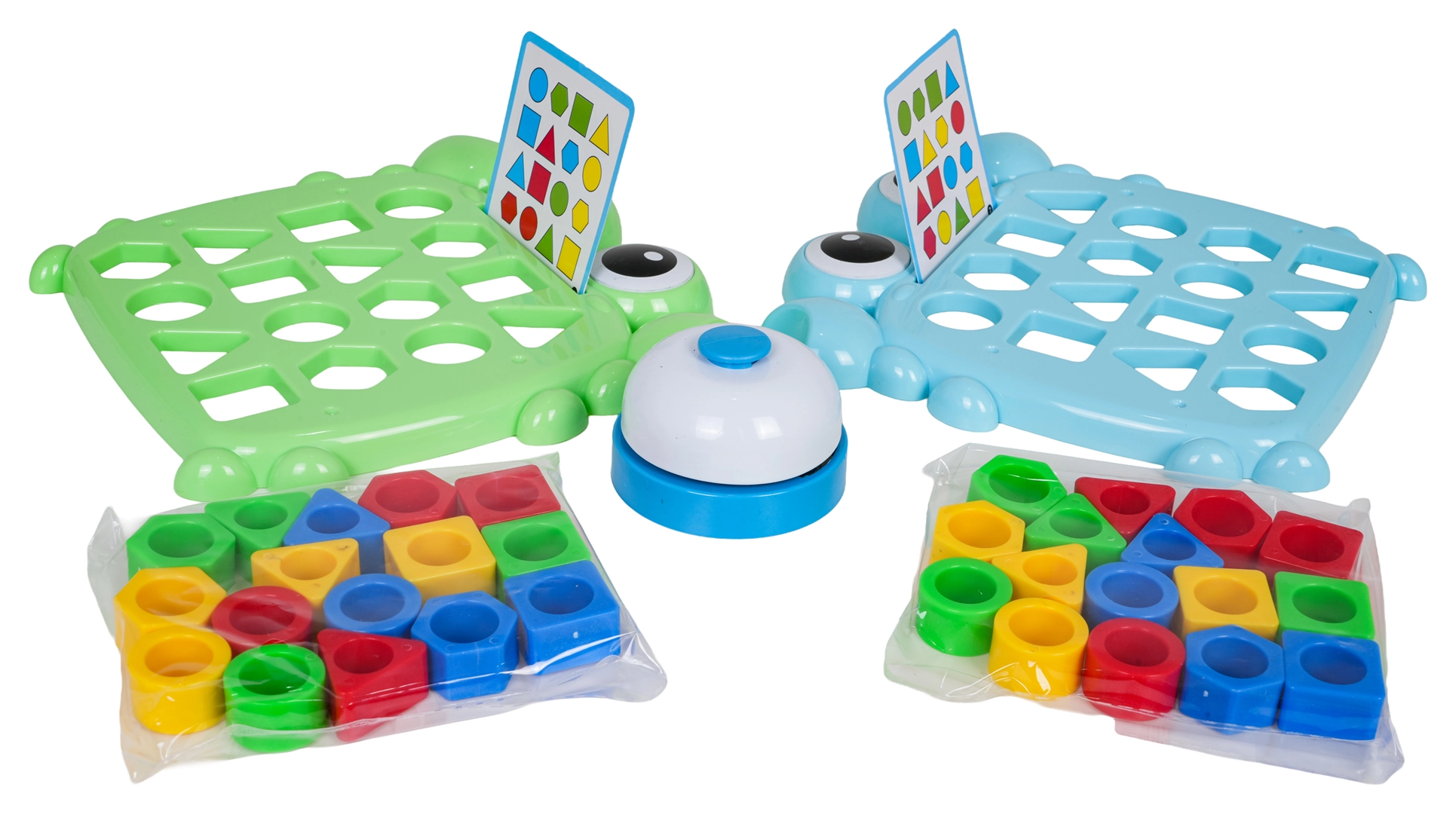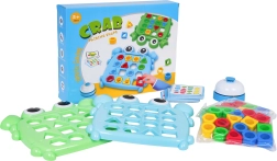 Ta privlačna otroška igra z rakom združuje učenje in tekmovanje. Otroci izberejo vzorčno karto, vstavljajo barvne oblike v odprtine na plošči in urijo logiko, pozornost in koordinacijo oko–roka. Pri igri v dvoje odloča hitrost – kdor prvi dokonča vzorec in pritisne zvonček, vzame karto.
