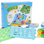 Robusten plast v živih barvah, dve igralni plošči v obliki raka, varni in lahko oprijemljivi delci za male roke.