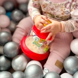 - Senzorična stimulacija: kontrastne barve, gibanje kroglic in nežni zvoki.
