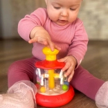 Ta barviti vrteči se kolovrat s konjičkom in kroglicami bo razveselil vsakega dojenčka. Dovolj je pritisniti rumeni zgornji gumb in notranji kolovrat se zavrti – kroglice oživijo ter ustvarijo privlačen prizor in nežno ropotanje. Igrača združuje zabavo in razvoj čutov v enem.