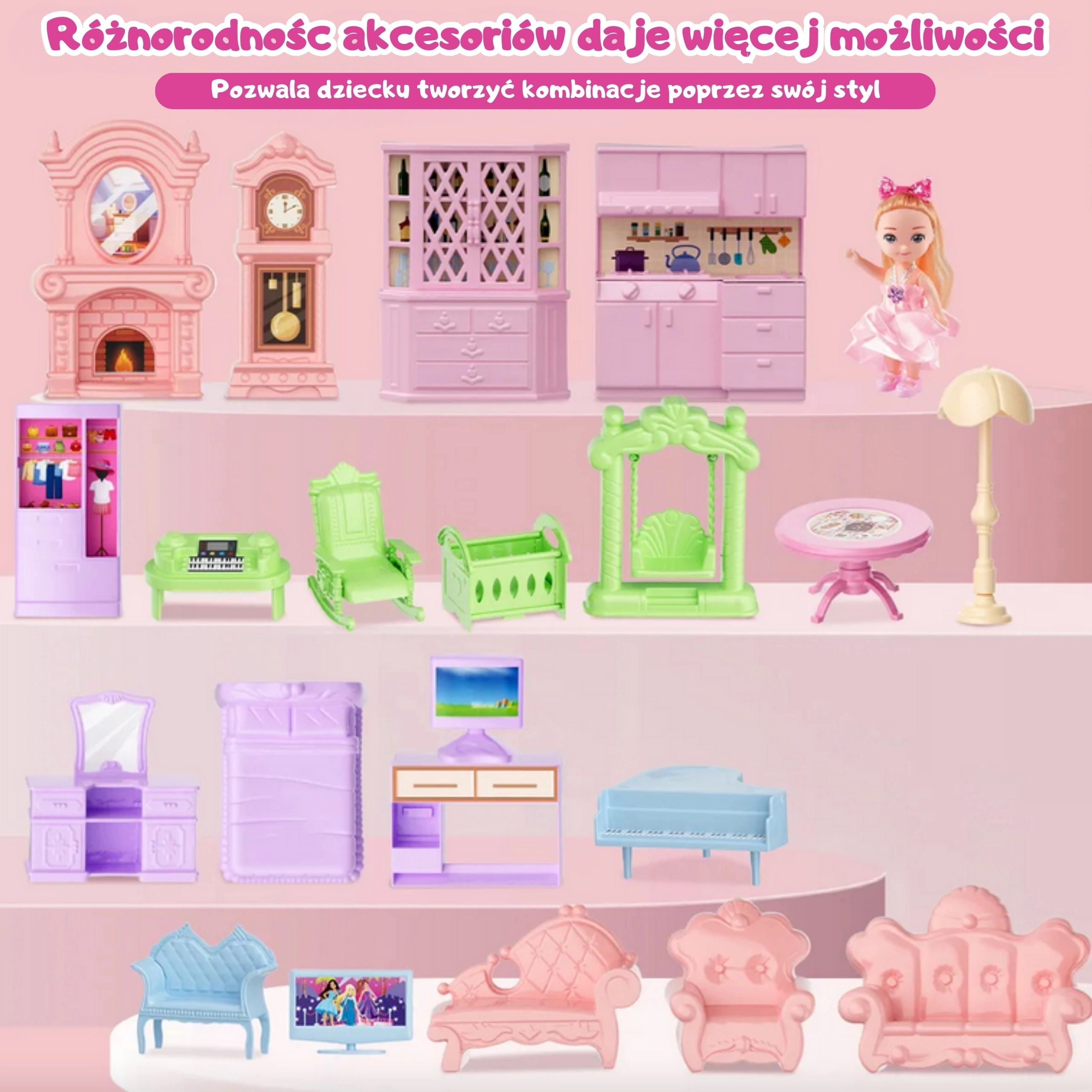 V kompletu je bogat dodatni pribor – pohištvo, dekoracije in figurice, zato lahko otroci interier poljubno preurejajo in načrtujejo. Varni materiali, zaobljeni robovi in kakovostna izdelava zagotavljajo brezskrbno igro že od 3. leta dalje.
