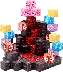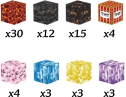 - 30× rdeče-črne kocke; 12× sive kocke; 16× črno-oranžne kocke; 4× kocke TNT; 4× rožnate kocke; 3× modre kocke; 3× vijolične kocke; 2× rumeni kocki