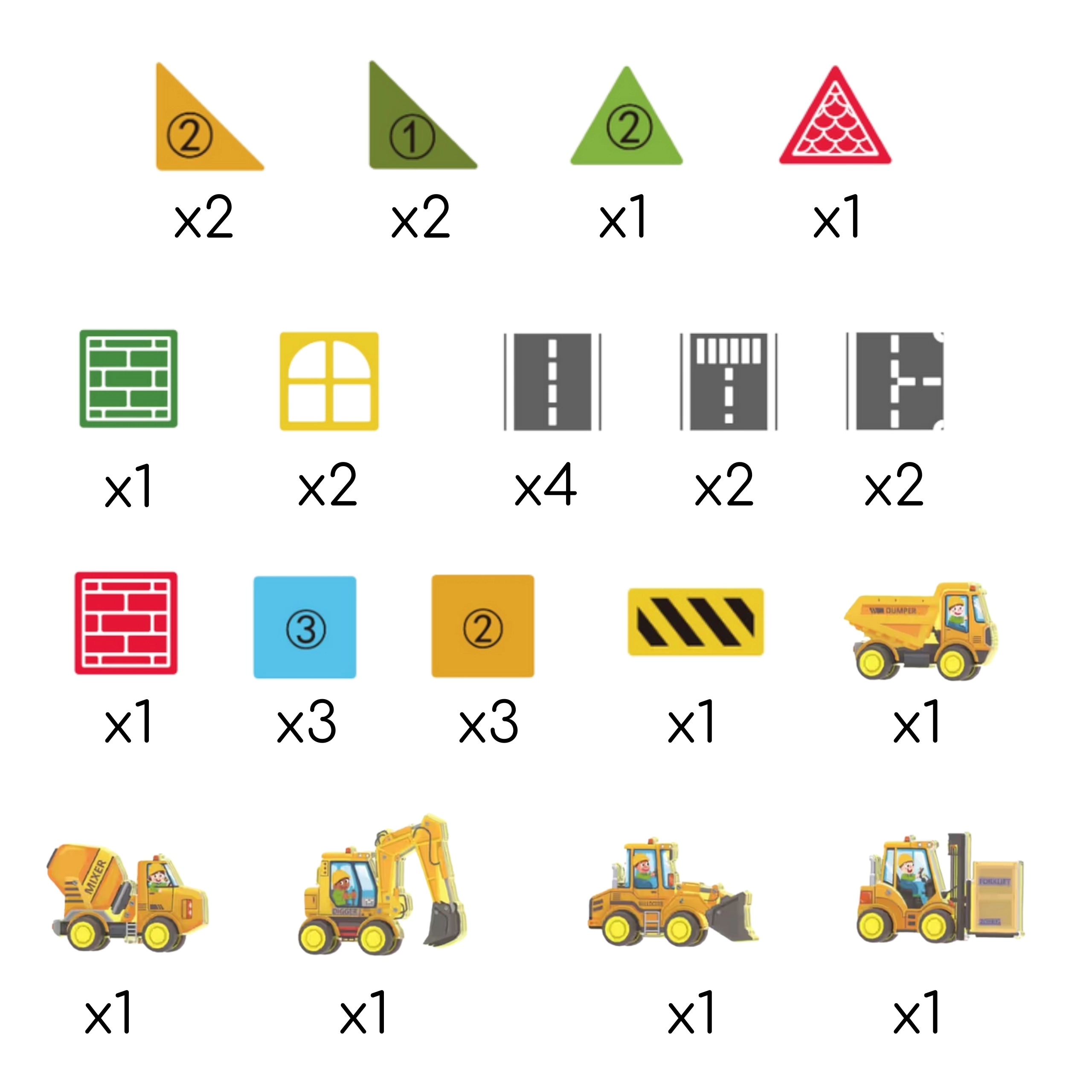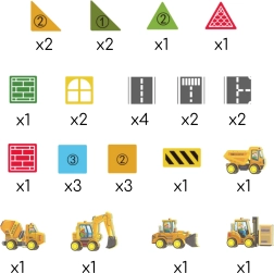 - 12 × kvadrat, 2 × trikotnik, 4 × trikotnik (različne vrste), 4 × cesta, 2 × okno, 1 × vrata